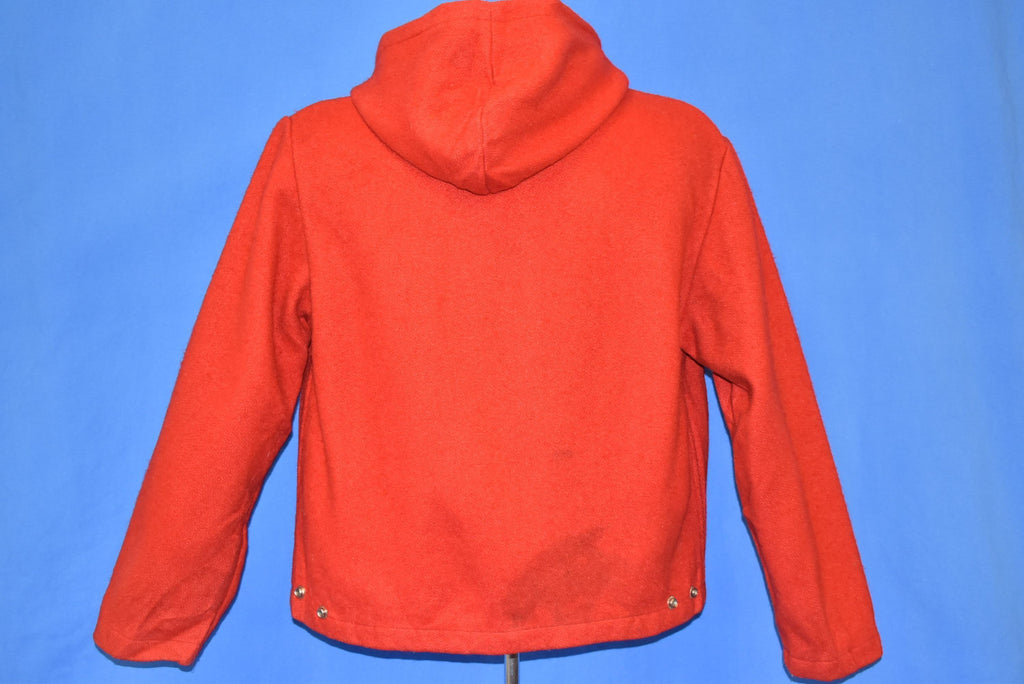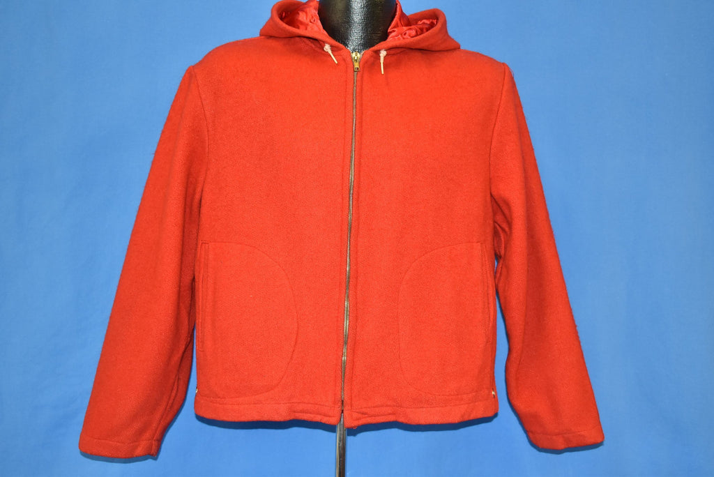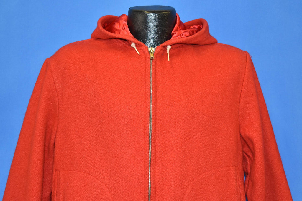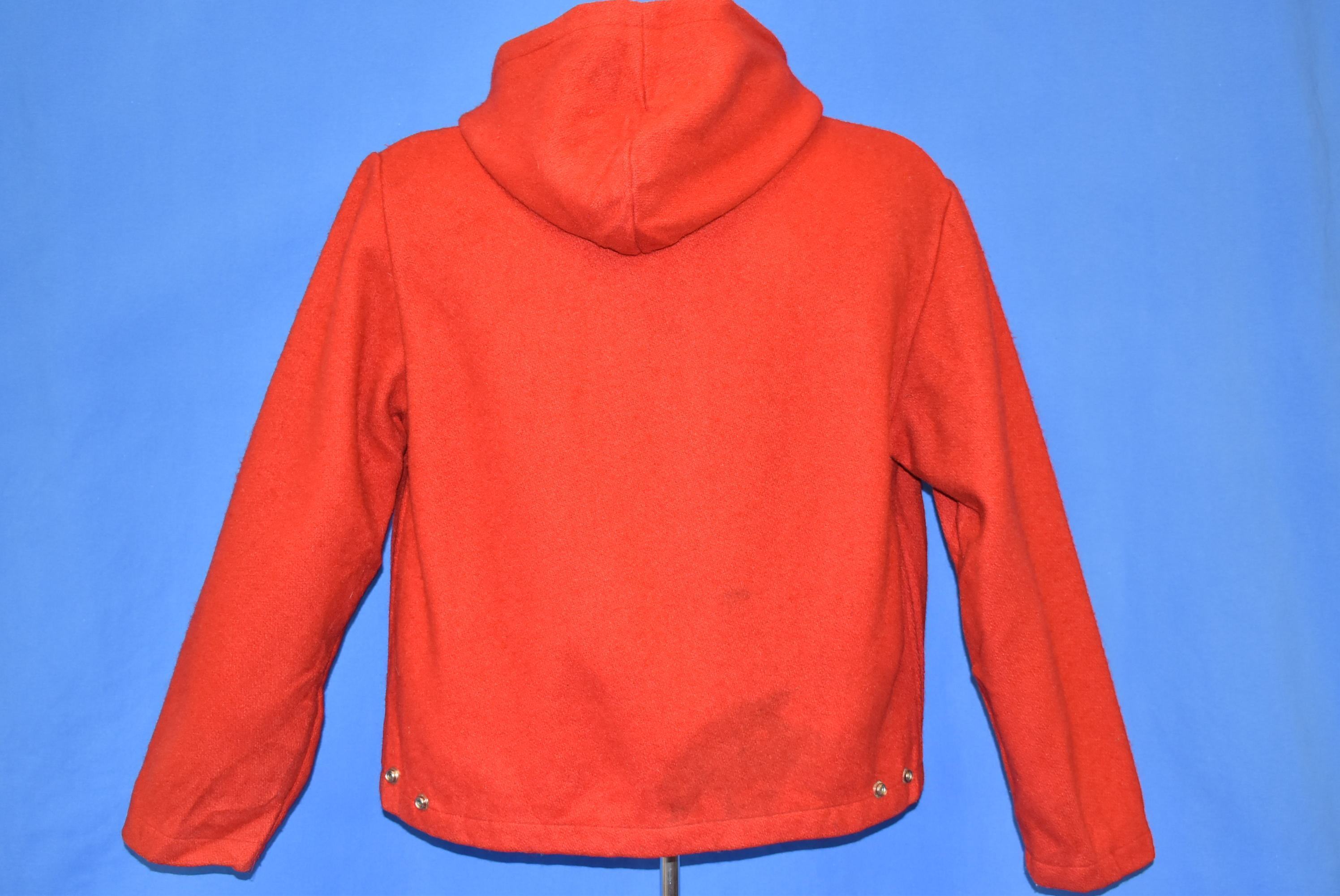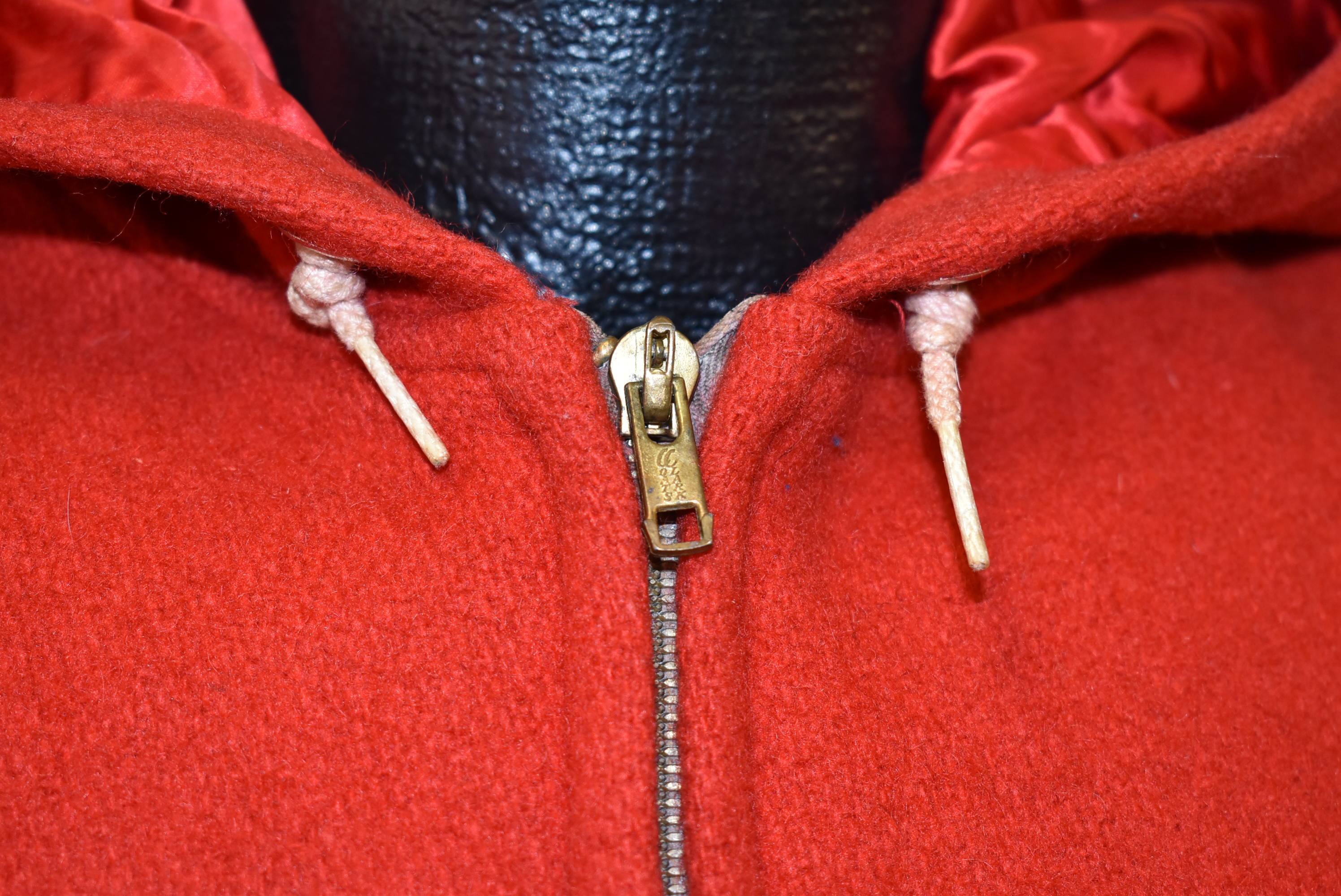 This cozy wool jacket is from Igloo in the 50s. It comes in nice bright red color with a drawstring hood and zipper closure. The jacket has two hand pockets, and the hood comes with a soft rayon lining.