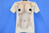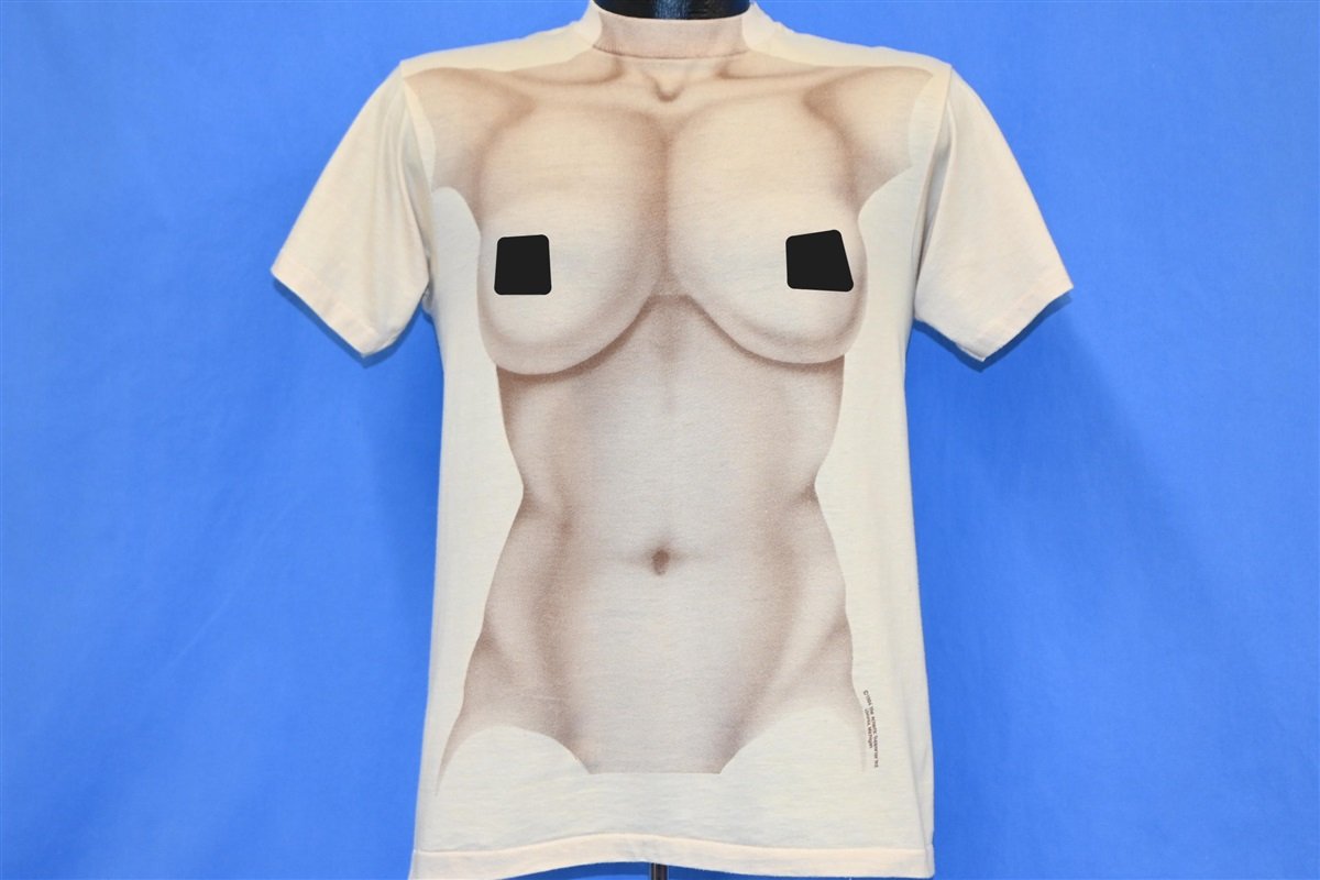 This unique vintage tee is from a brand called the Athletic Supporter Ltd. This Michigan based t-shirt printer used to specialize in costume tees, which were all designed to make the wearer look like they were dressed in various outfits aside from t-shirts. One of the most famous examples was their classic tuxedo t-shirt, which has been a humorous alternative to formal wear for many years. This shirt isn't designed quite like the brand's other tees however. This shirt shows off a naked body, specifically a woman's body.