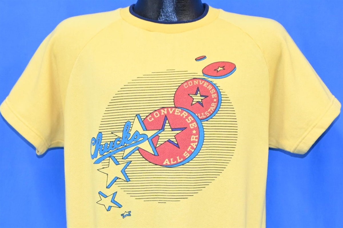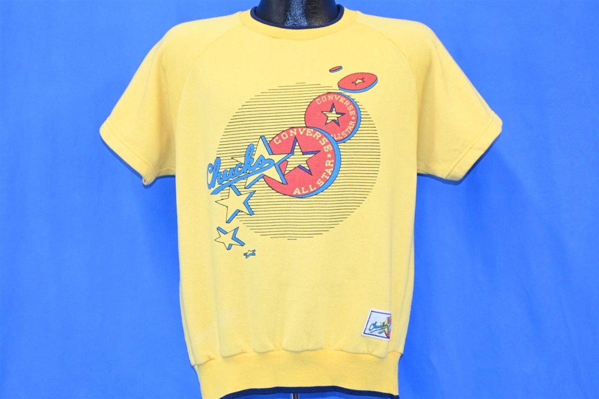 The shoes have had many nicknames throughout the years on this sweatshirt they are called "Chucks," but they have also been called "Converse", "Cons", "All Stars" and "Chucky Ts". During the 80s Chucks were seen on Tom Hanks in Bachelor Party, Michael J. Fox in Back to the Future, on basketball playing cast members in Hoosiers, and more. Converse have also worked on a lot of different collaborations with other brands and franchises, including Super Mario, The Clash, Miley Cyrus, and Andy Warhol.