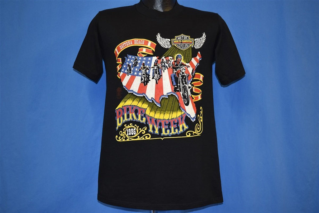 This vintage tee is an original keepsake from the 1986 Daytona Bike Week. It's held up great and perfectly captures that old school biker vibe featuring wild graphics, double sided print, and tons of patriotic imagery like the USA flag and classic Harley choppers.