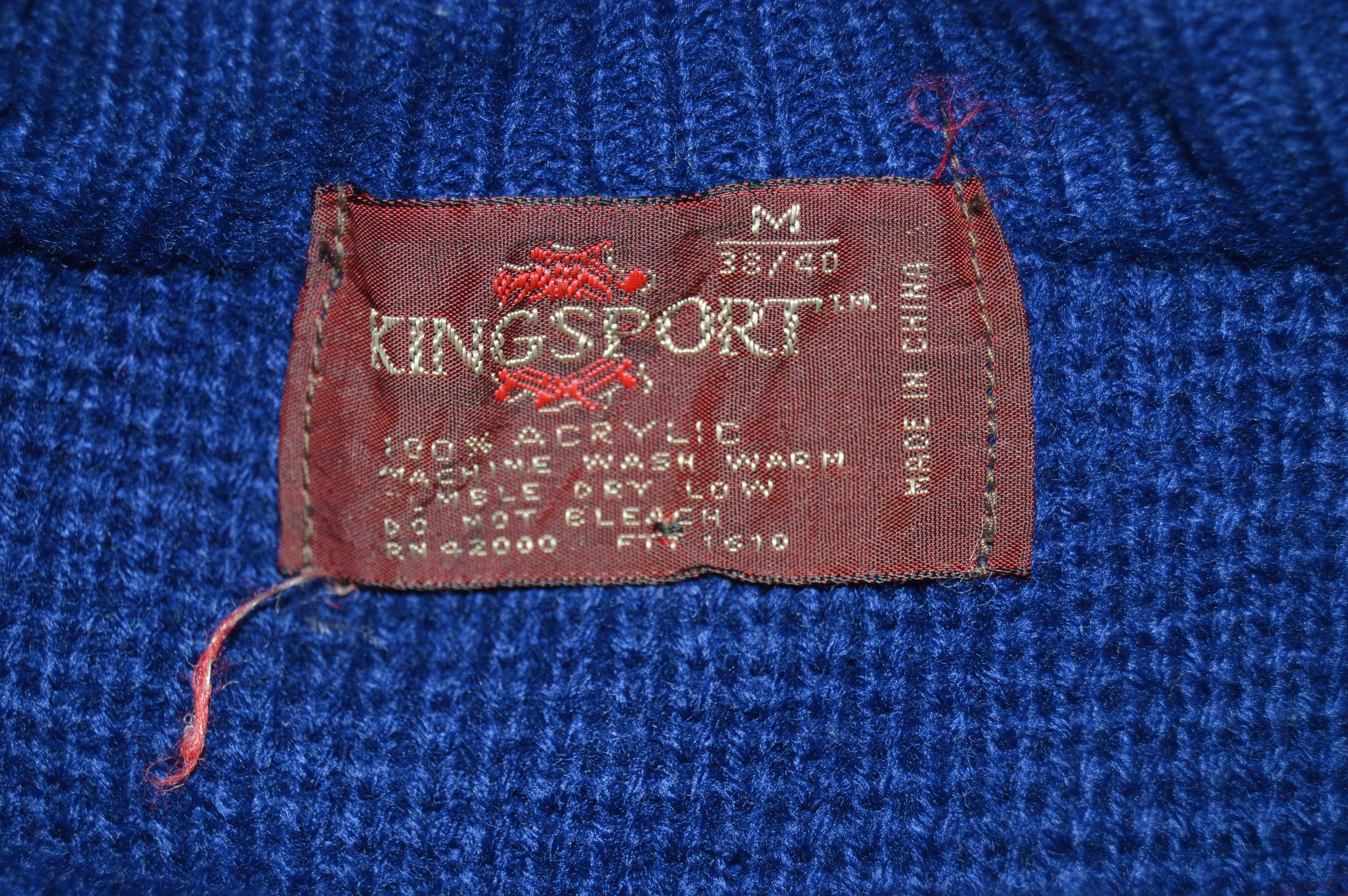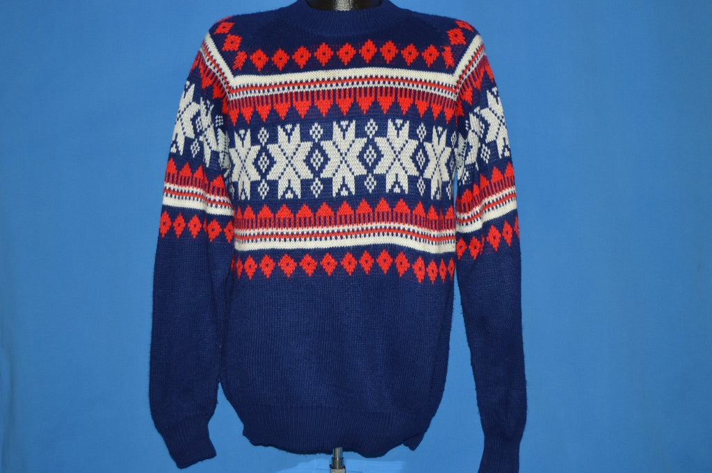 This acrylic crewneck sweater is from the 1980s. It features a red, white and blue knitted snowflake design on the chest and upper sleeves and raglan sleeves.