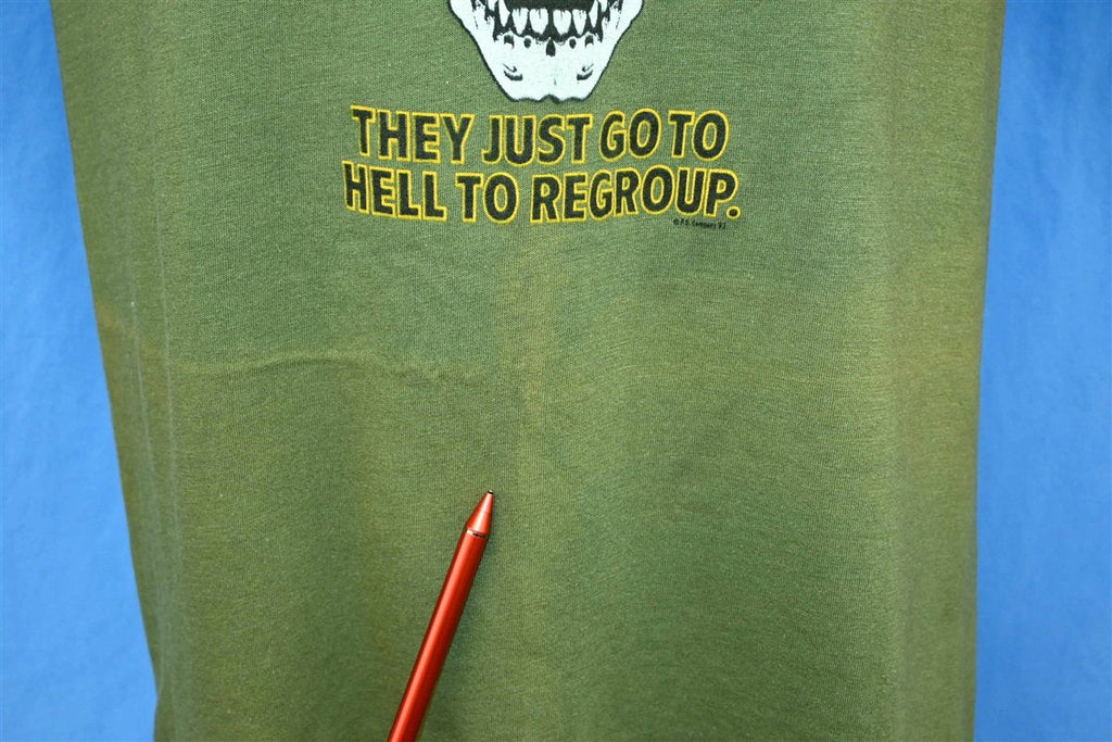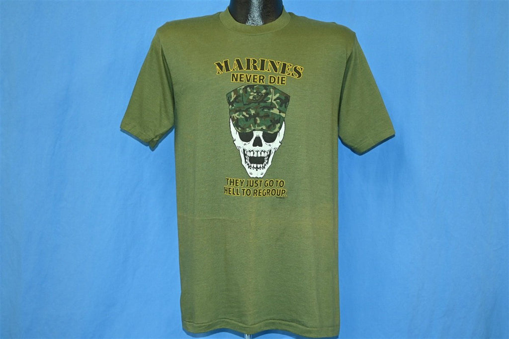 This cheeky, vintage marines tee features a graphic of a skull wearing a camo hat and the phrase, "Marines never die, they just go to hell to regroup." The Marines Corps are officially a part of the US Department of the Navy, although they're separate from the Navy and have their own procedures and training. The Marines are uniquely trained to handle amphibious operations, meaning by both land and water. They are also known for having the hardest recruit training of any military branch and for being the first to be called into combat when the country is at war. The Marines are a fraction of the size of the other main branches of the military and, because of this, are known for having a strong sense of pride and camaraderie with each other.