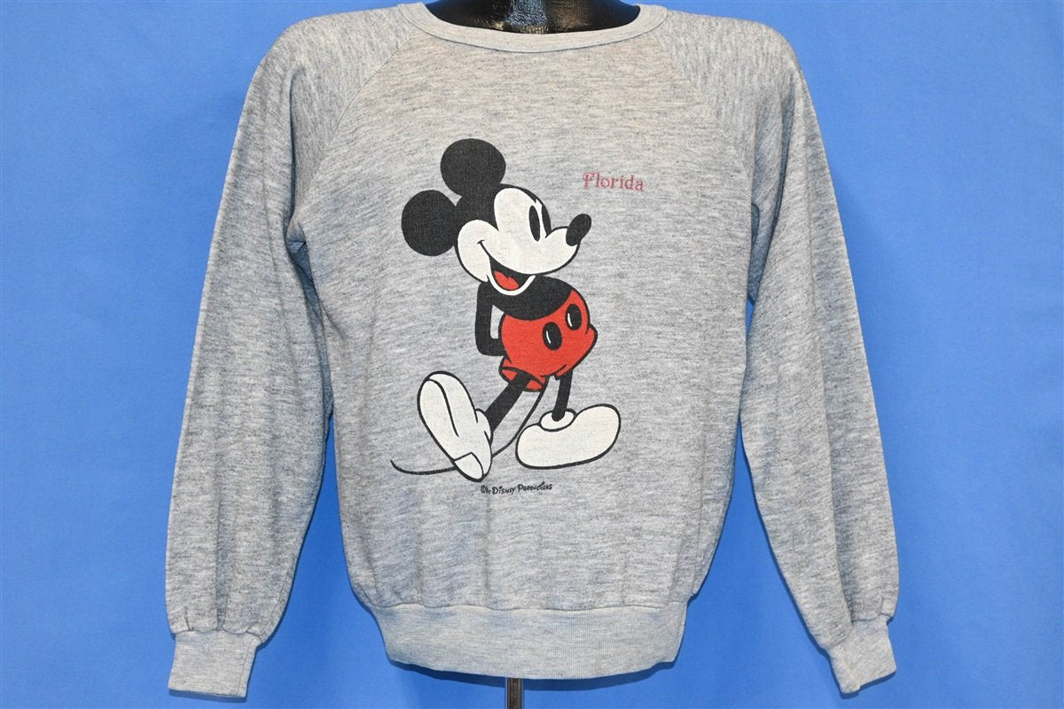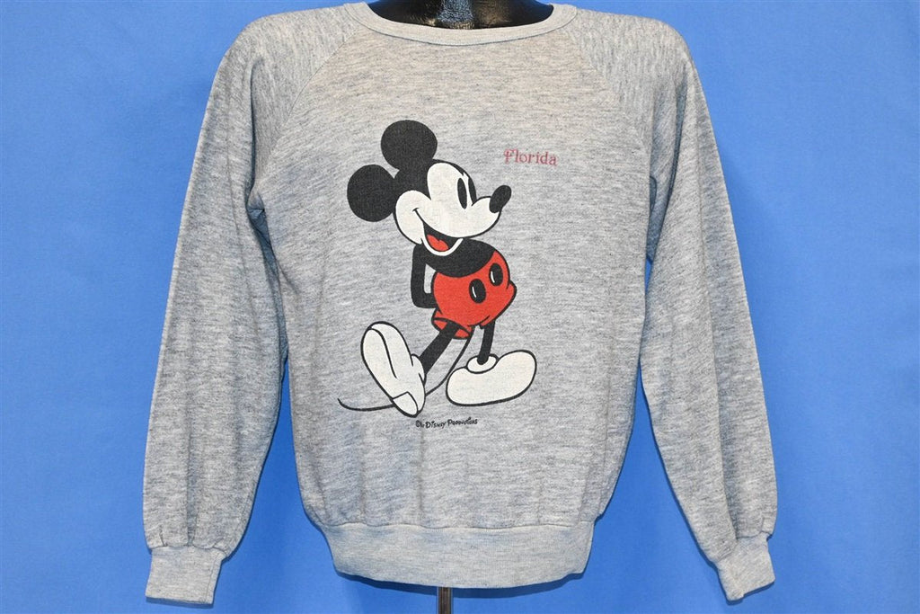 This classic sweatshirt features the Disney Company's beloved animated mascot Mickey Mouse. This shirt is from Florida, and could have very likely been a souvenir from Walt Disney World. The sweatshirt dates back to the 80s, which was an exciting decade full of change for the company. It was the decade that Michael Eisner took over as Disney CEO, and the 80s also saw the opening of two new Disney theme parks, Epcot and what would come to be known as Hollywood Studios.