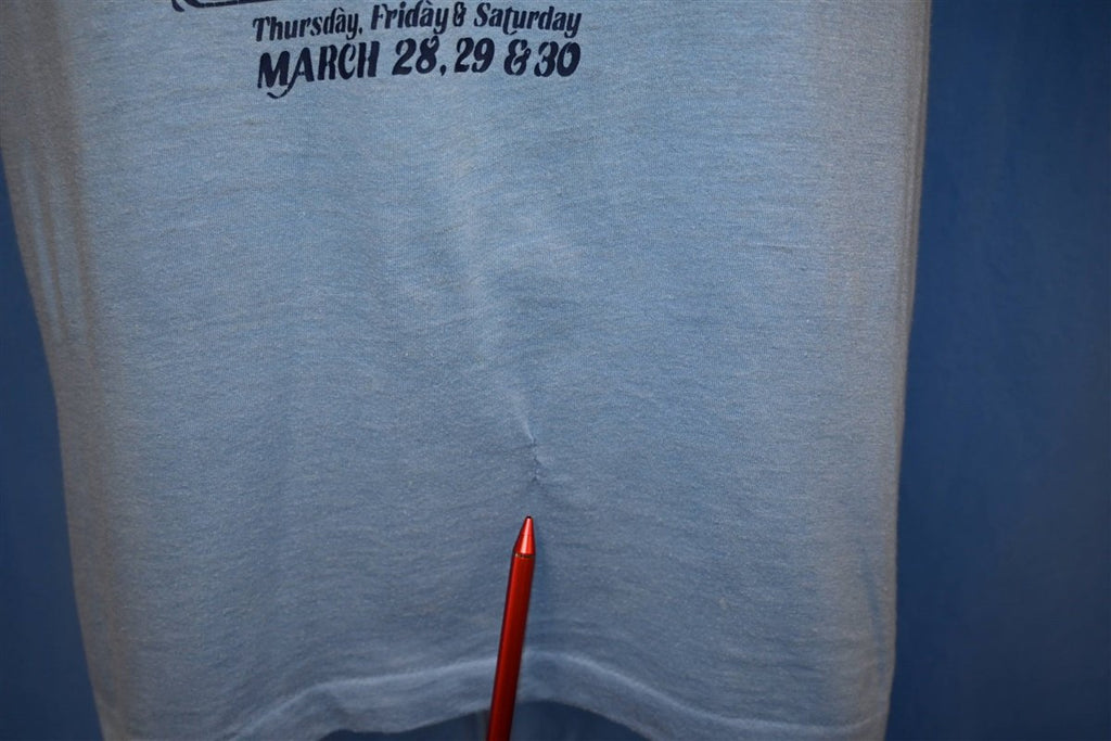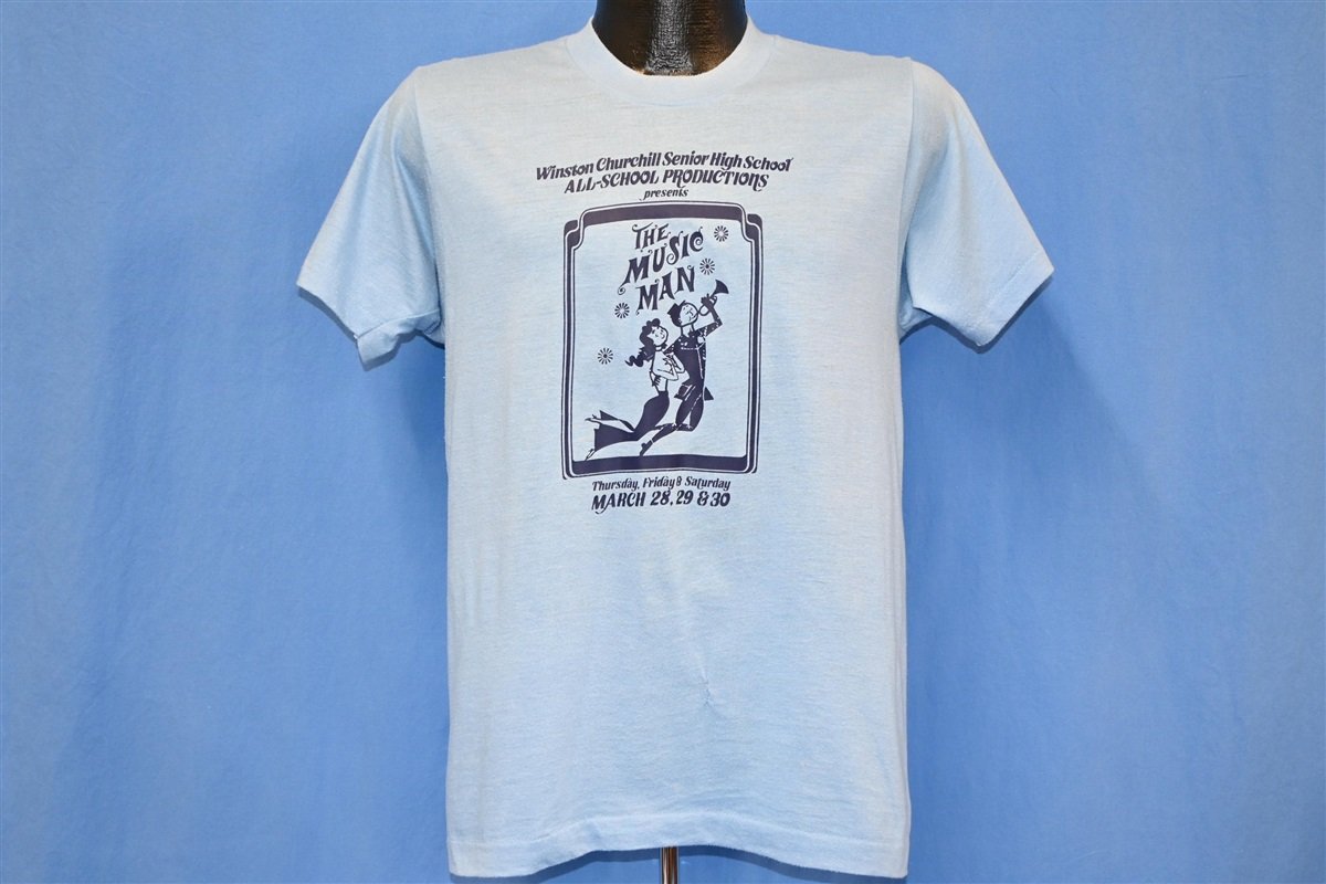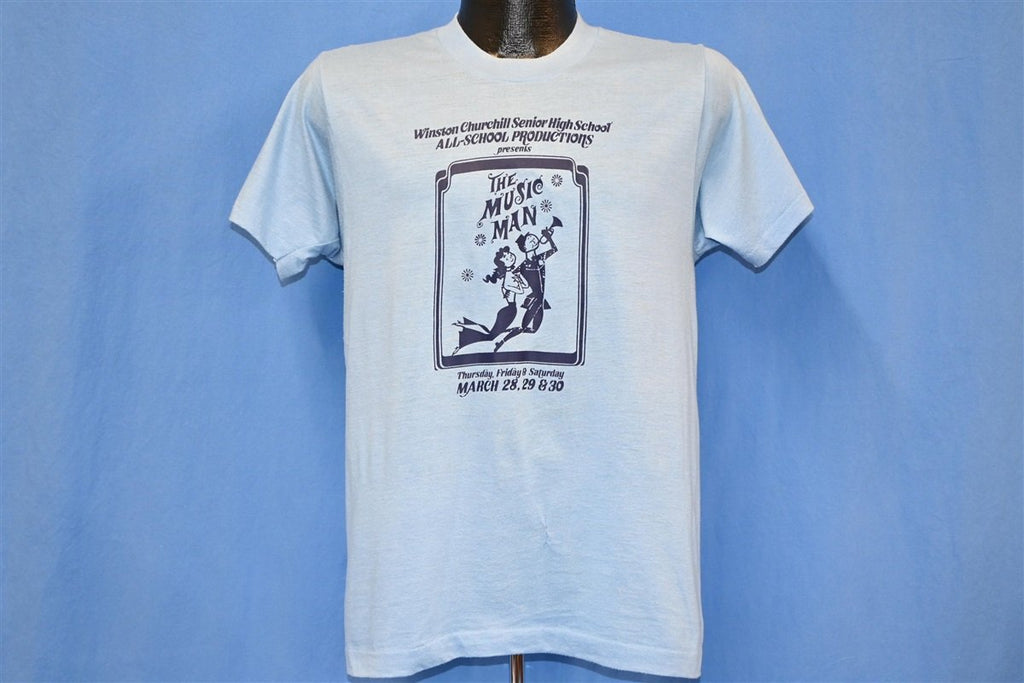This cool shirt commemorates a local high school production of the classic Broadway musical, the Music Man, written by Meredith Wilson and Franklin Lacey. The Music Man centers around the story of a con man named Harold Hill, who tries to sell band instruments to a small Midwestern town, but winds up falling in love with the town librarian. The production from this shirt took place at a Winston Churchill High School, although there are several schools across the US that share that name. This tee could have come from any of the various schools named after the former UK Prime Minister.