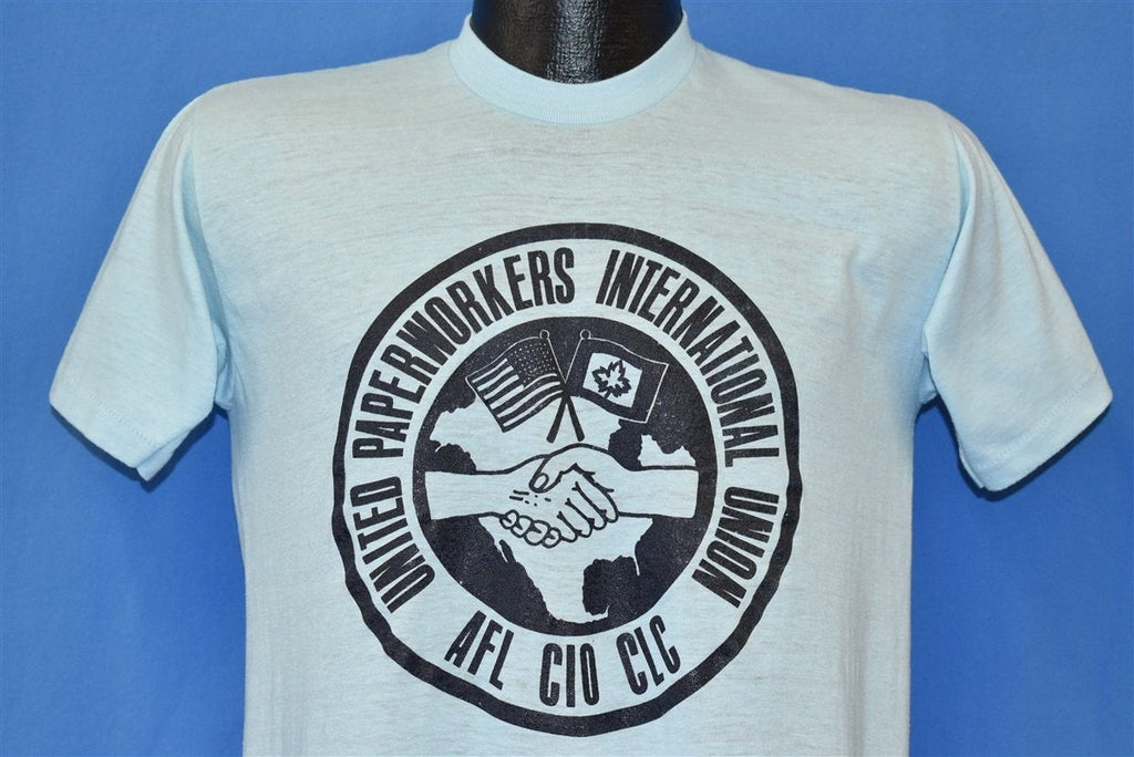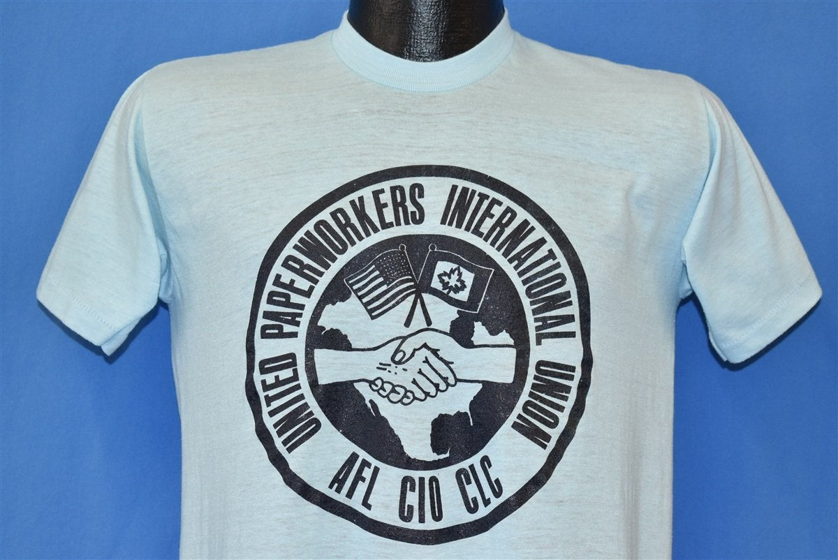 This vintage tee is dedicated to the United Paperworkers International Union circa 1980s. It's held up great over the years and ready for many more. Features soft poly cotton, old school gaphics, and a classic Leisure Knit tag.