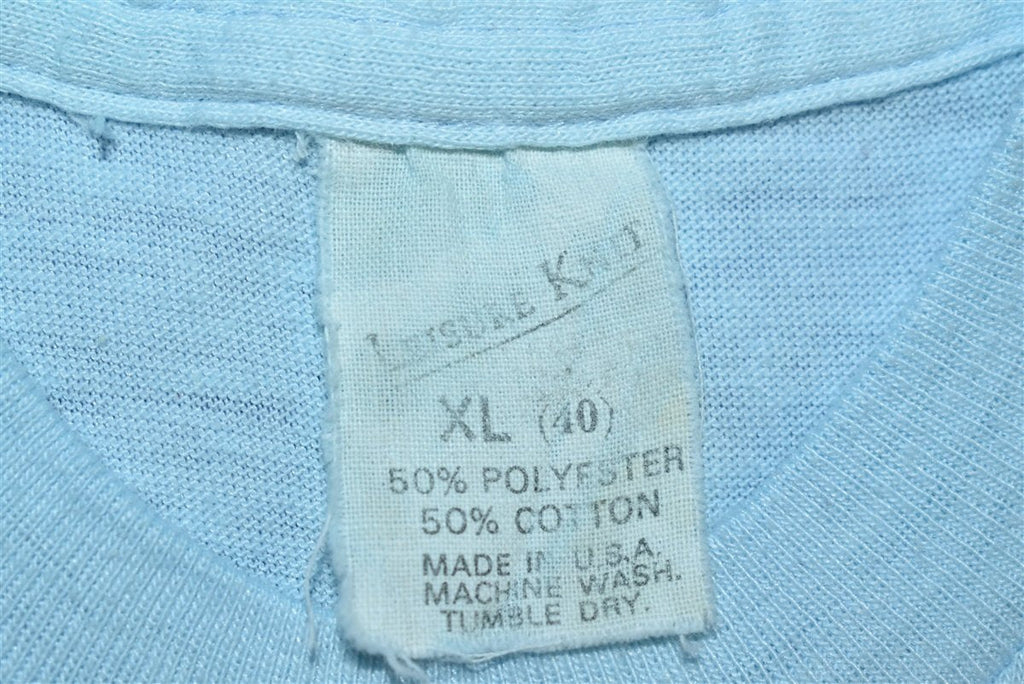 Fits like a modern unisex adult medium. This shirt is light blue.