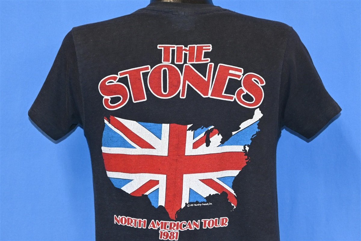 This sweet vintage t-shirt is a keepsake from the Rolling Stones North American Tour 1981. This tour was in promotion of their album Tattoo You, which mostly consisted of studio outtakes from the 70s that didn't make it on to other albums. Some hit tracks from Tattoo You include "Waiting on a Friend" and "Start Me Up," the latter being one of the Rolling Stones most popular songs to date. Tattoo You was the Stones' 8th consecutive album to reach the top of the Billboard 200 and it consistently appears on "Greatest Albums" lists.