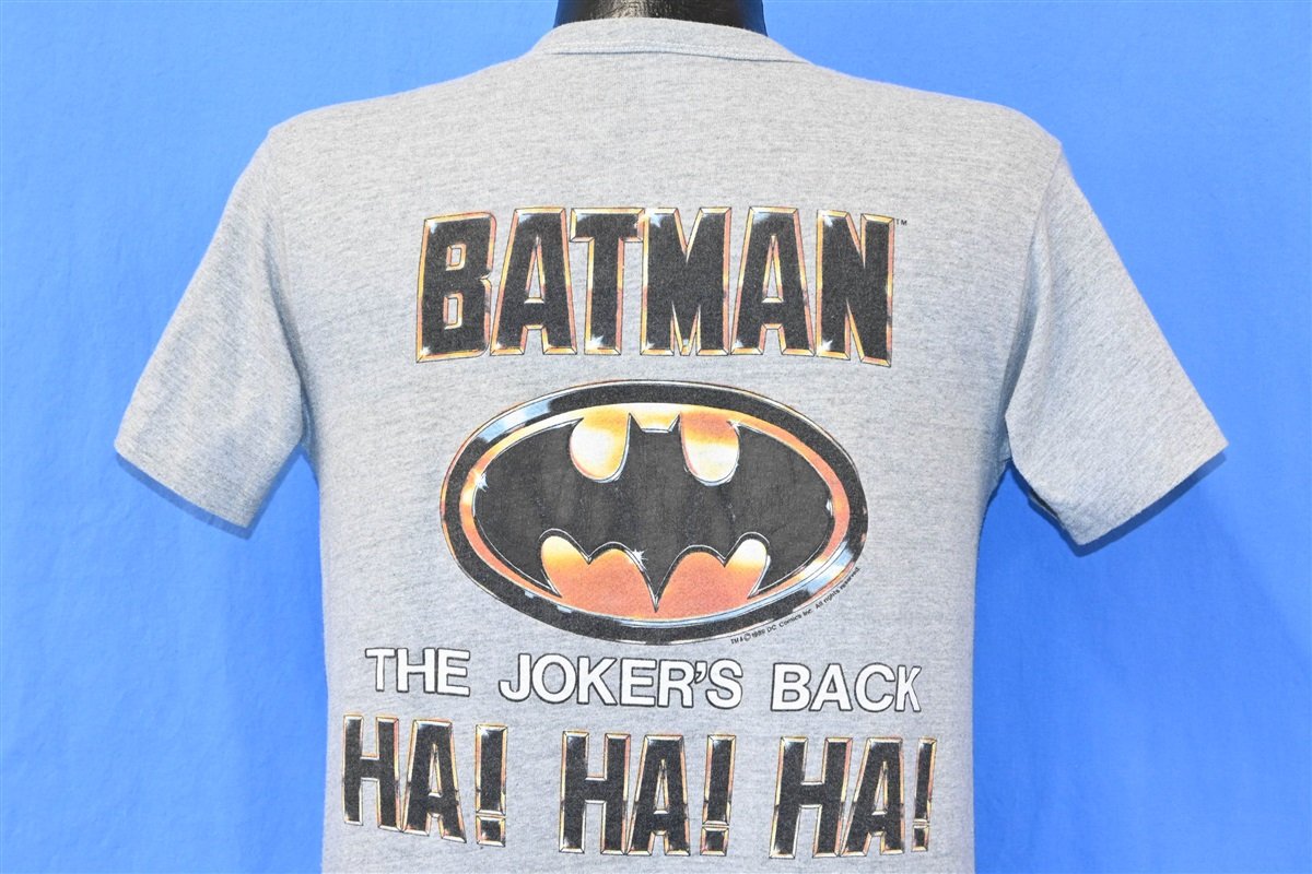 This sweet double-sided t-shirt promotes the 1989 Batman film directed by Tim Burton and starring Michael Keaton as the world's greatest detective. This was the first live action theatrical film to center around the DC comics hero since the 1960s, and it was both a critical and commercial success. This amazing shirt showcases the iconic villain of the movie, Batman's most notorious arch nemesis, the Joker, who was portrayed in the film by the Academy Award winning actor Jack Nicholson.