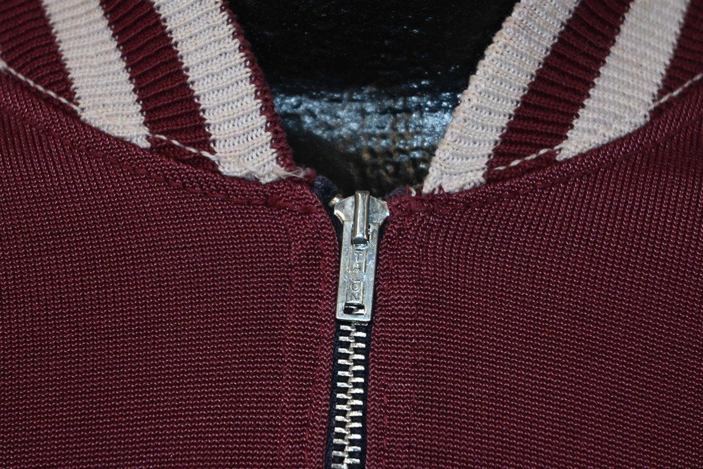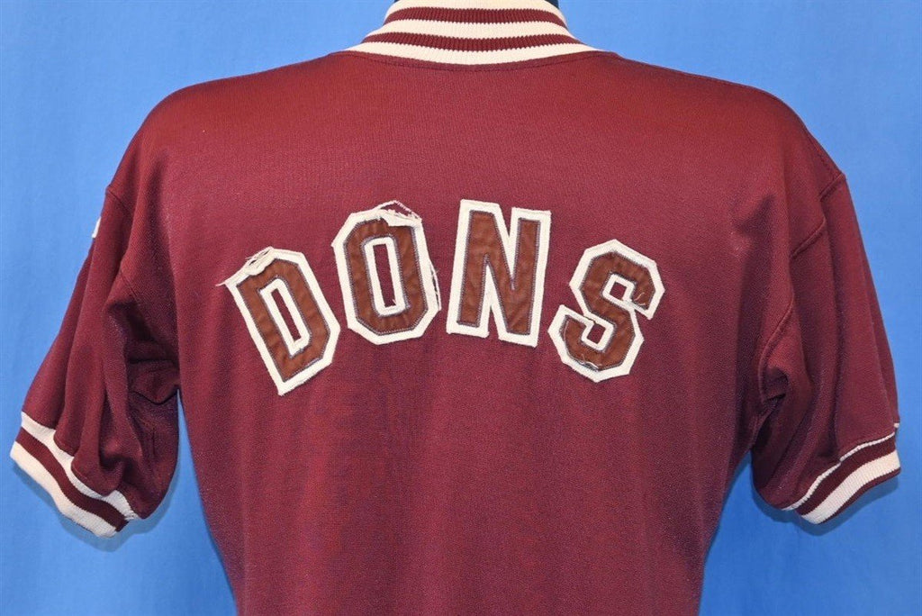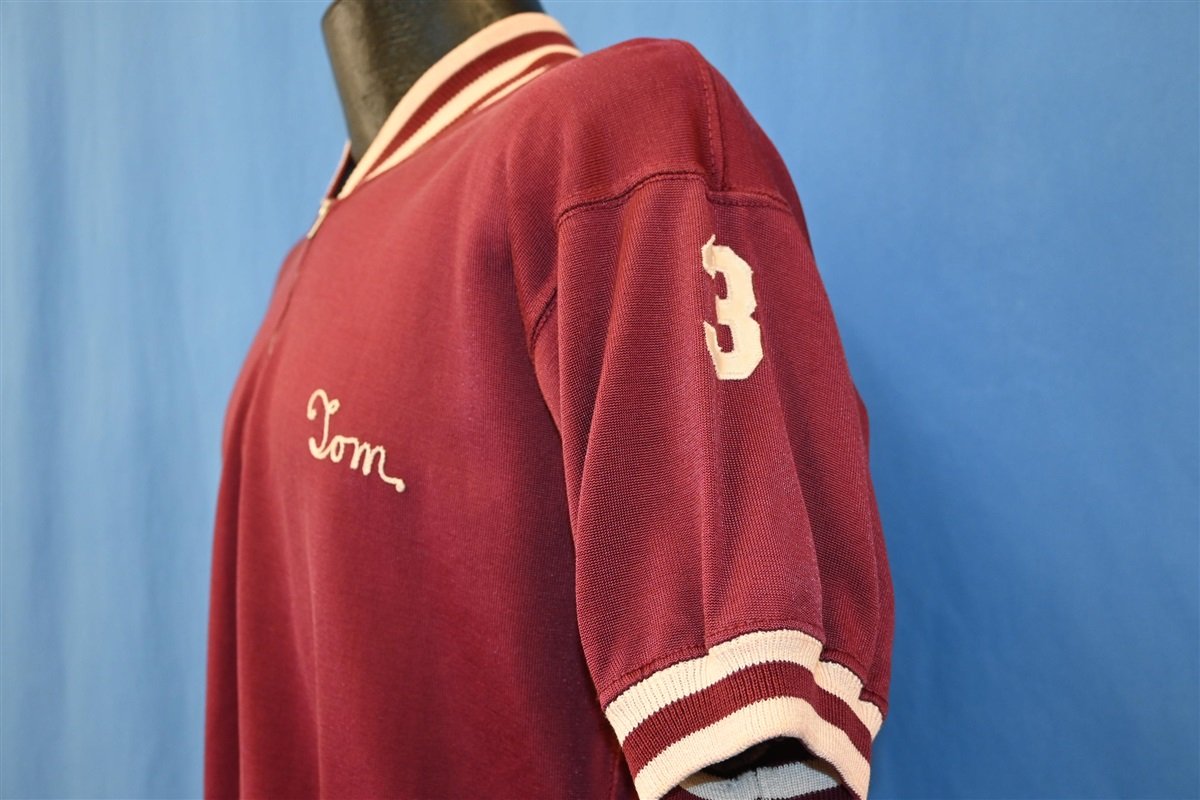 This cool quarter zip style jersey was made all the way back in the 50s, and it's held up wonderfully for more than half a century. The shirt includes a metal Talon zipper and comes in a rich shade maroon. The jersey features embroidered details like the number 3 and "Dons" sewn onto the back. This was likely the name of a local business that sponsored the team the jersey was made for. The shirt also has the name of its previous owner, Tom, chain stitched onto the front.