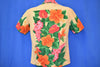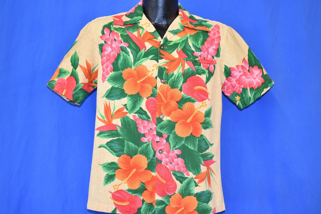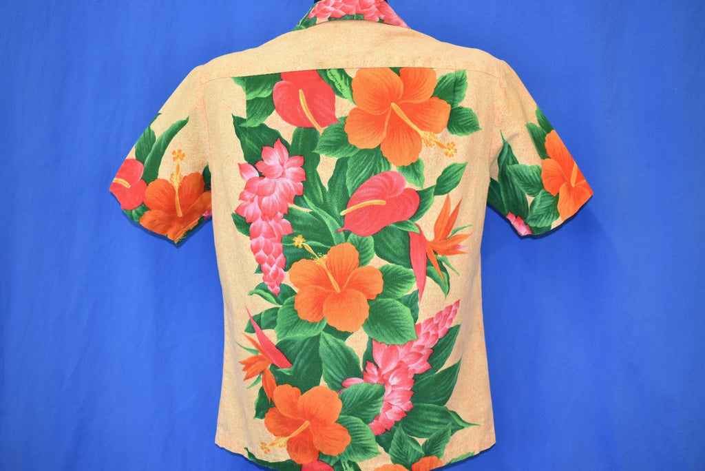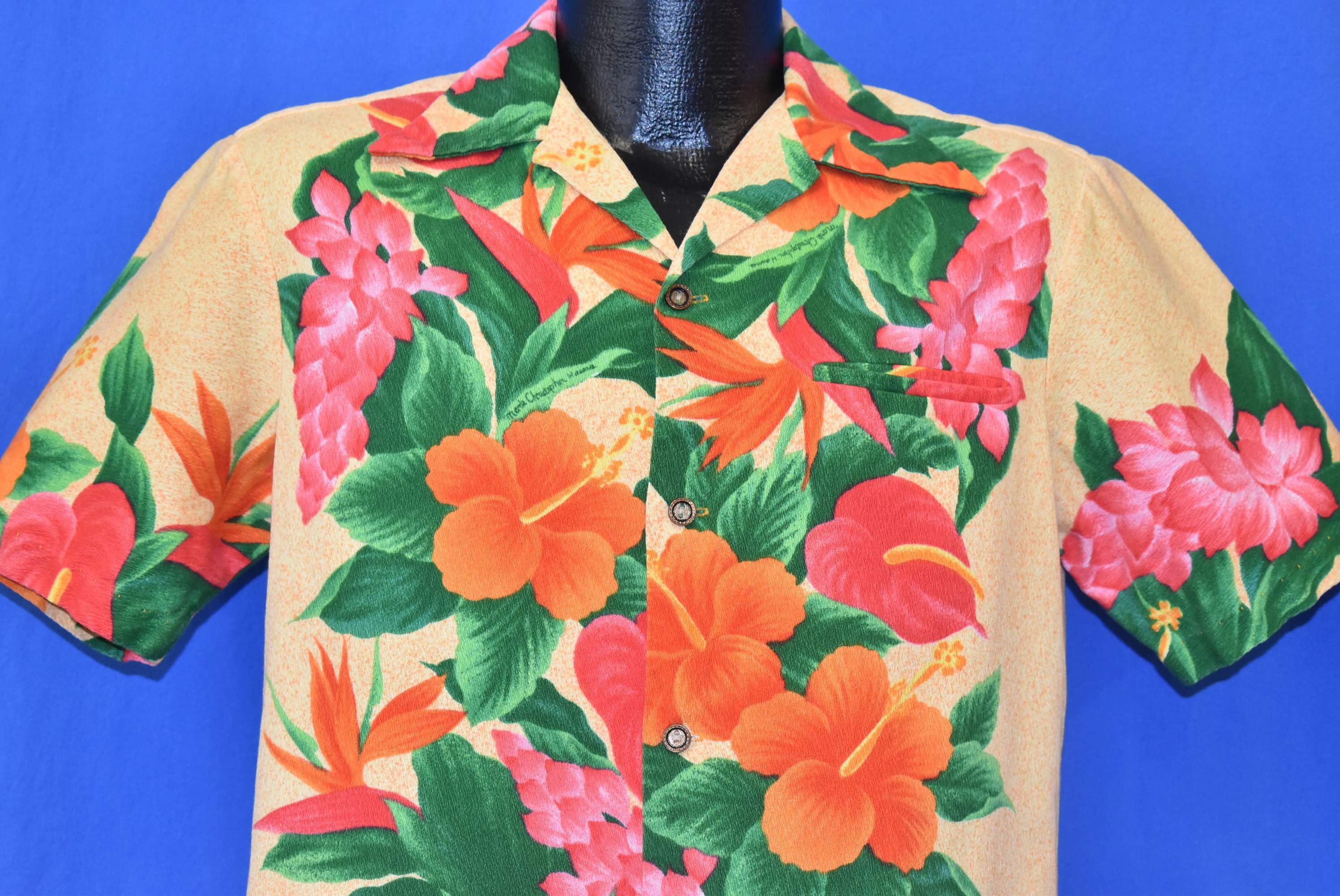 This aloha shirt is from the 1960s and features a floral design by Mark Christopher full of Hawaiian hibiscus, bird of paradise, laceleaf and red ginger flowers.