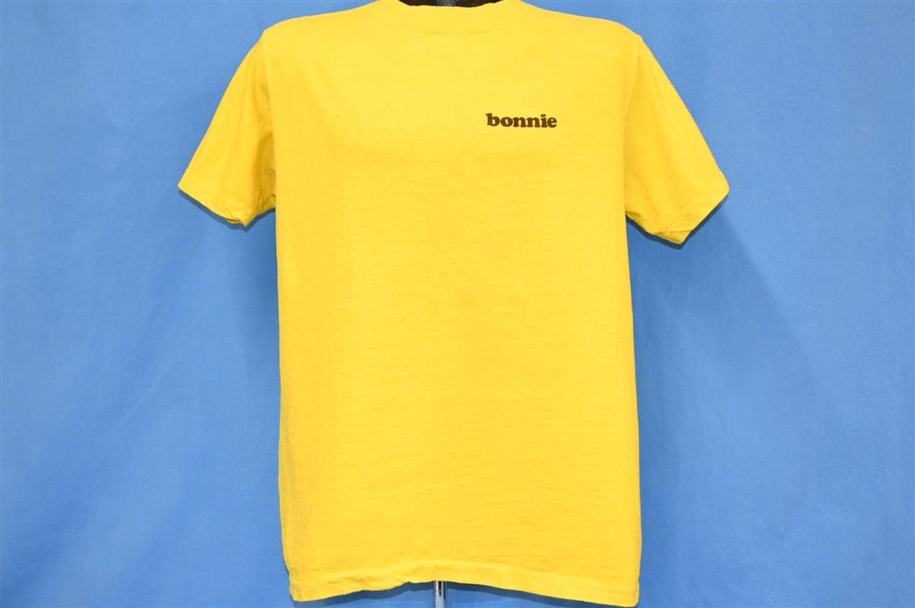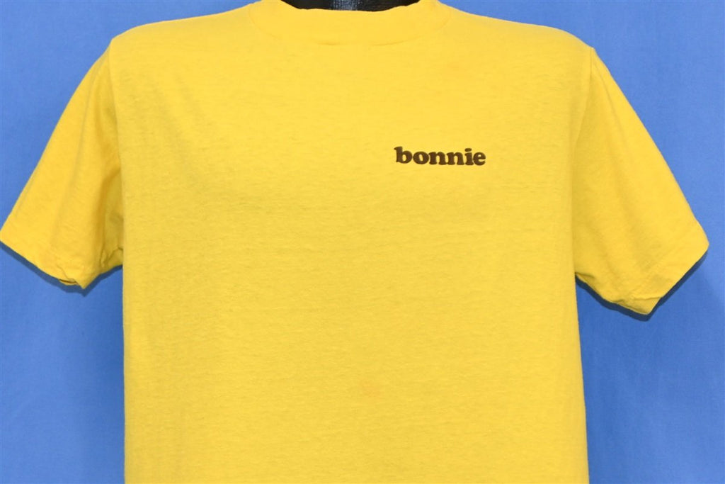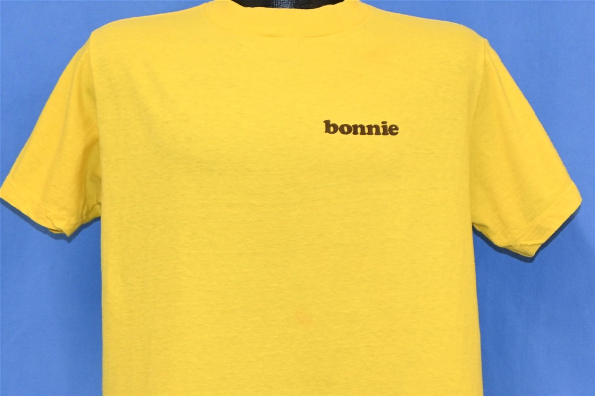 This sweet 70s tee has the name Bonnie on the front. The back of the tee says "G.A.S. Keeps the pressure up!" It is unclear what this tee was made for but regardless of its origins, this tee features a cool graphic, bold colors, and a sweet slogan.