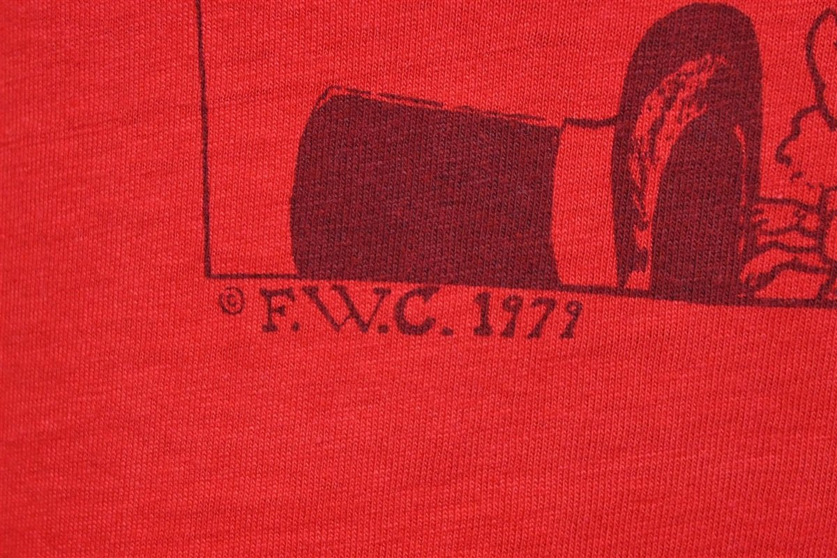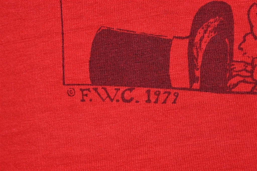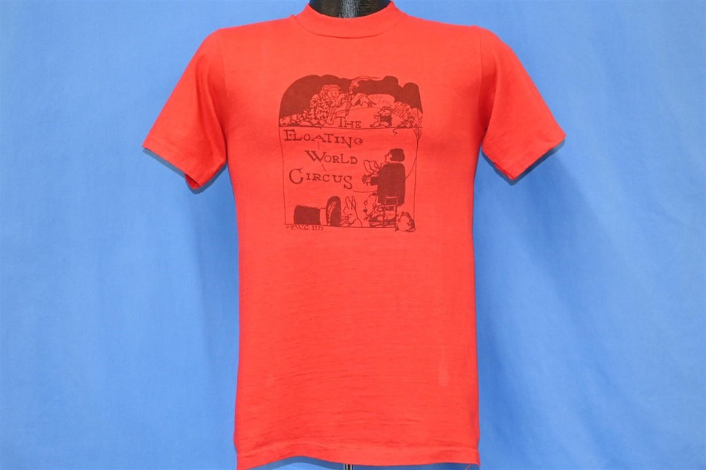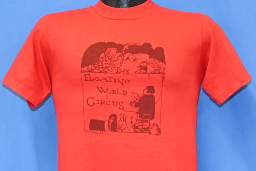 This cool vintage tee was made to promote the Floating World Circus, a one ring professional circus that was founded in 1976 in Seattle, Washington. It was started by professional juggler, Greg Albert, and the circus' performers were trained in dance, drama, music, gymnastics, and visual arts, with some of them even serving as instructors at the Cornish Institute and the University of Washington's Experimental College. The Floating World Circus chose to use one ring as a way to honor European circus traditions and maintain intimacy with their audiences.