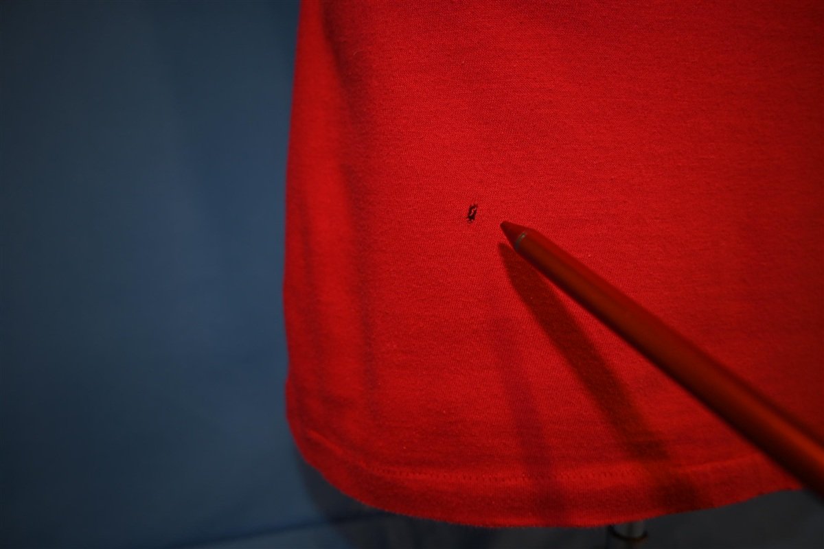 Fits like a modern unisex adult small. There is a small spot and a small hole on the back, see pics.