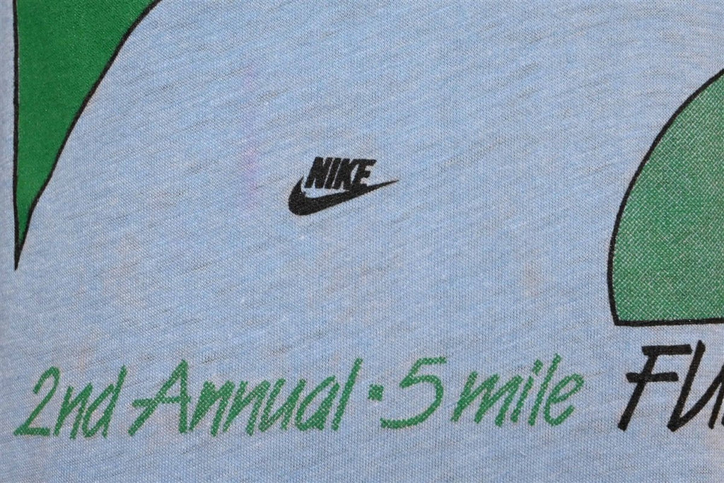 This awesome tee celebrates a 1984 Fun Run that took place in Kaneohe, Hawaii. The run took place at the popular Kaneohe Bay Shopping Center and it was sponsored by Nike. At the time, the footwear company had yet to make it big, and it would be several years before they launched their viral "Just Do It," campaign. As Nike was still making a name for themselves, they spent a lot of time sponsoring small foot races such as this one.