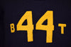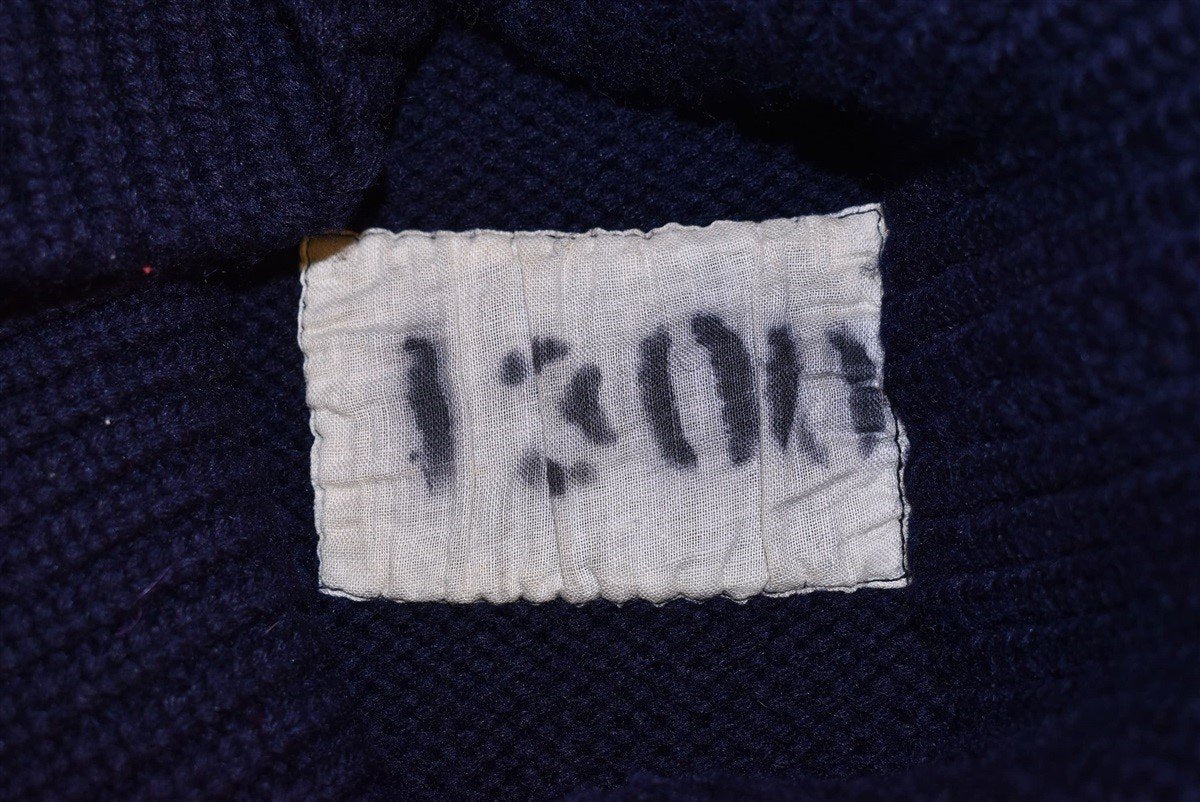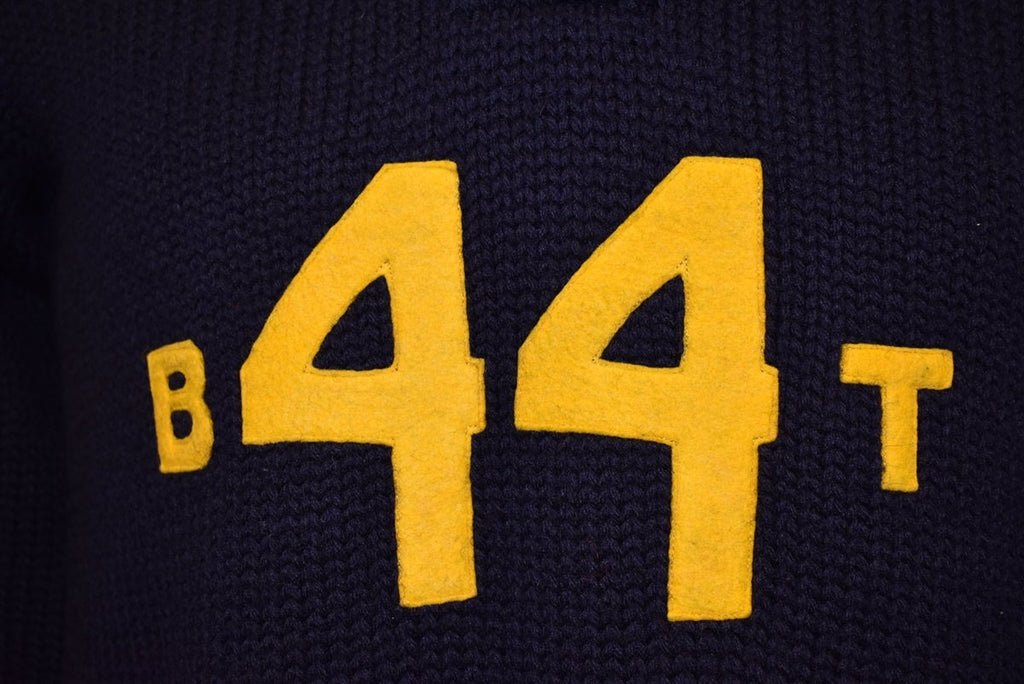 This dark blue sweater is from the 1940s and comes with a shawl style v-neck collar. This sweater was issued to a sailor of the United States Navy during World War II. The front has wool letters sewn onto it, specifically the letters BT and the number 44. Patches like this were once issued to midshipmen when they graduated from the Naval Academy, and the number at the center denotes the year they graduated, in this case 1944.