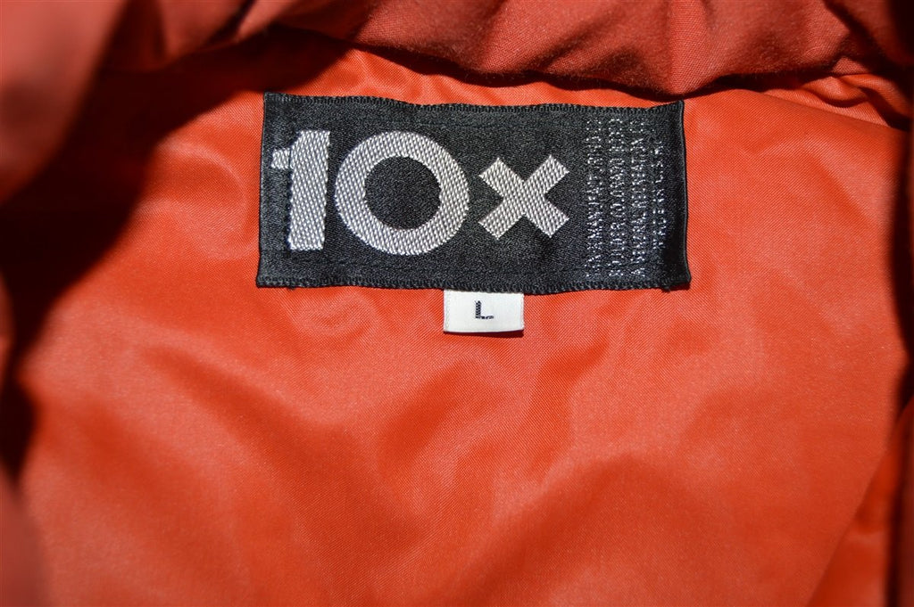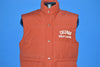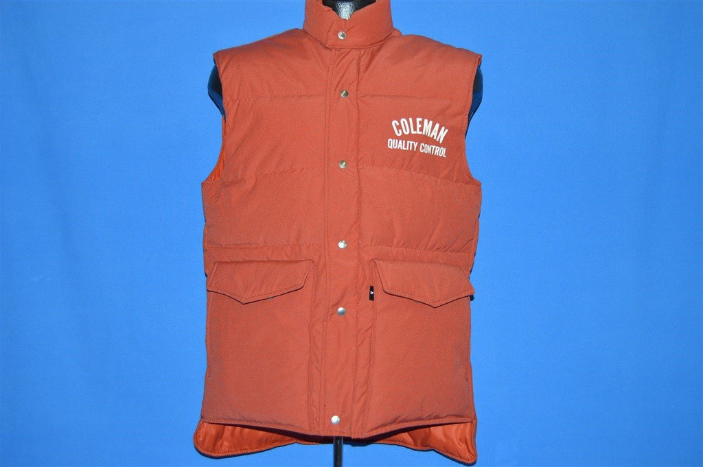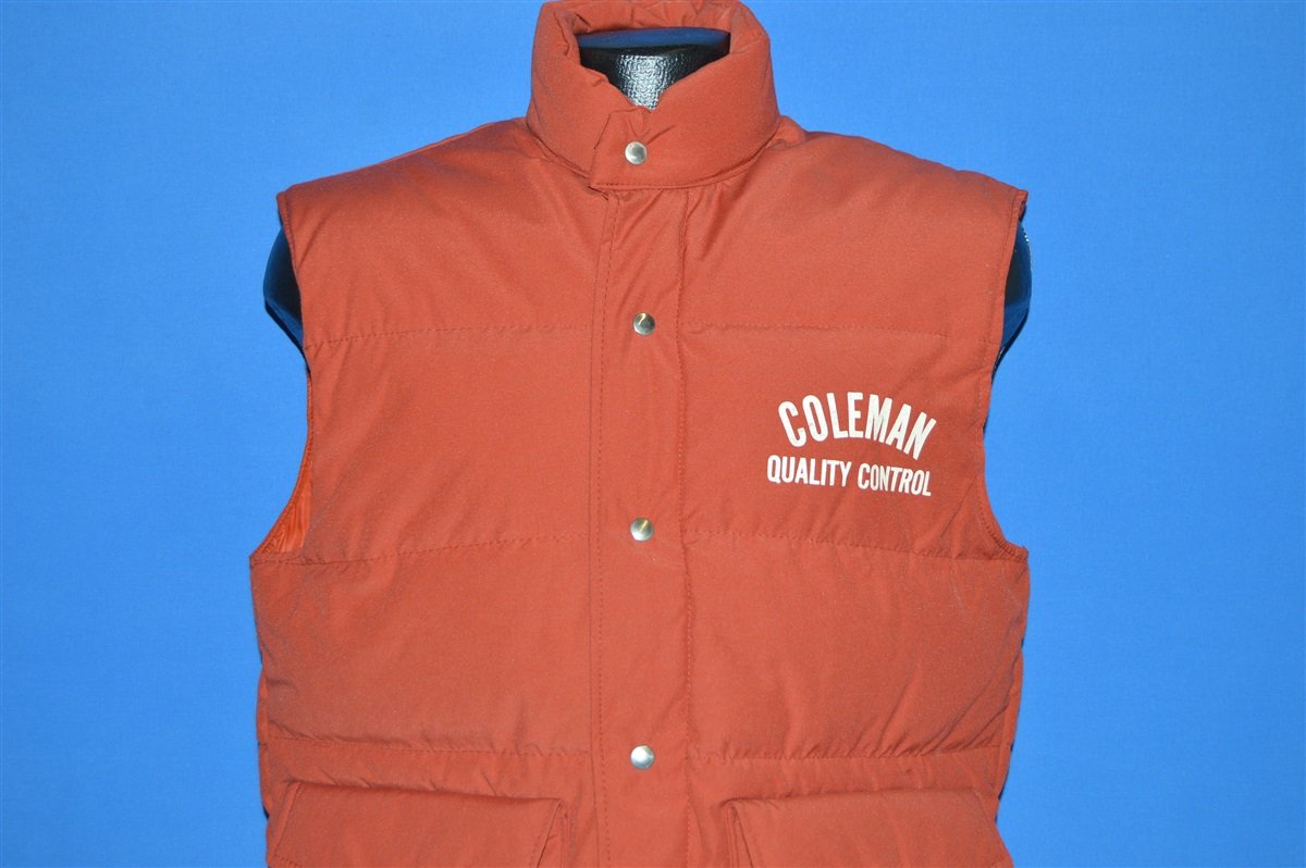 This maroon puffy ski vest is down filled and has the words "Coleman Quality Control" embroidered on the front upper left. There are two flap pockets on the front bottom. The back of the vest is longer at the bottom than the front. It has snap closures on the front.