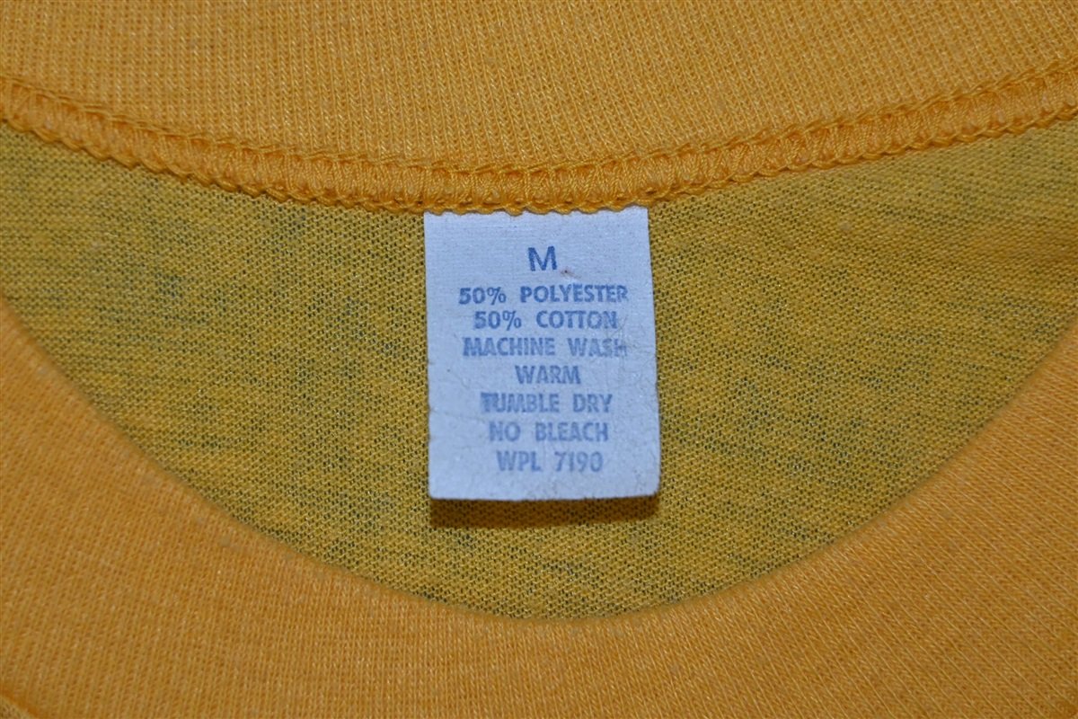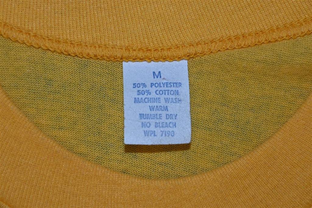 This vintage tee features a humorous iron on graphic designed for anyone who loves a nice mug of beer. The glittery graphic reads, "Beer drinkers get more head," offering a cheeky double entendre in regards to the layer of foam that often gathers at the top of a freshly poured beer. This shirt was made in the 80s, when comical iron on decals were a popular and easy way to make your own custom graphic tees at home.