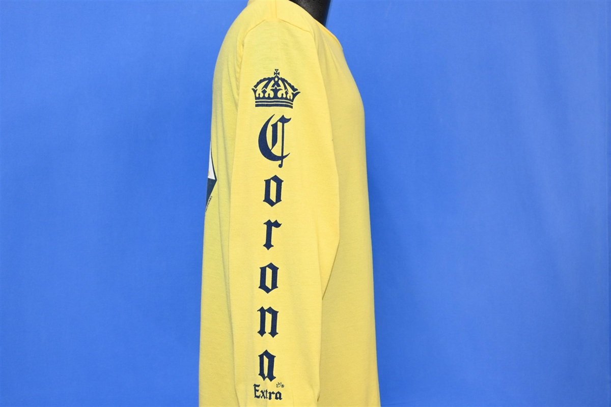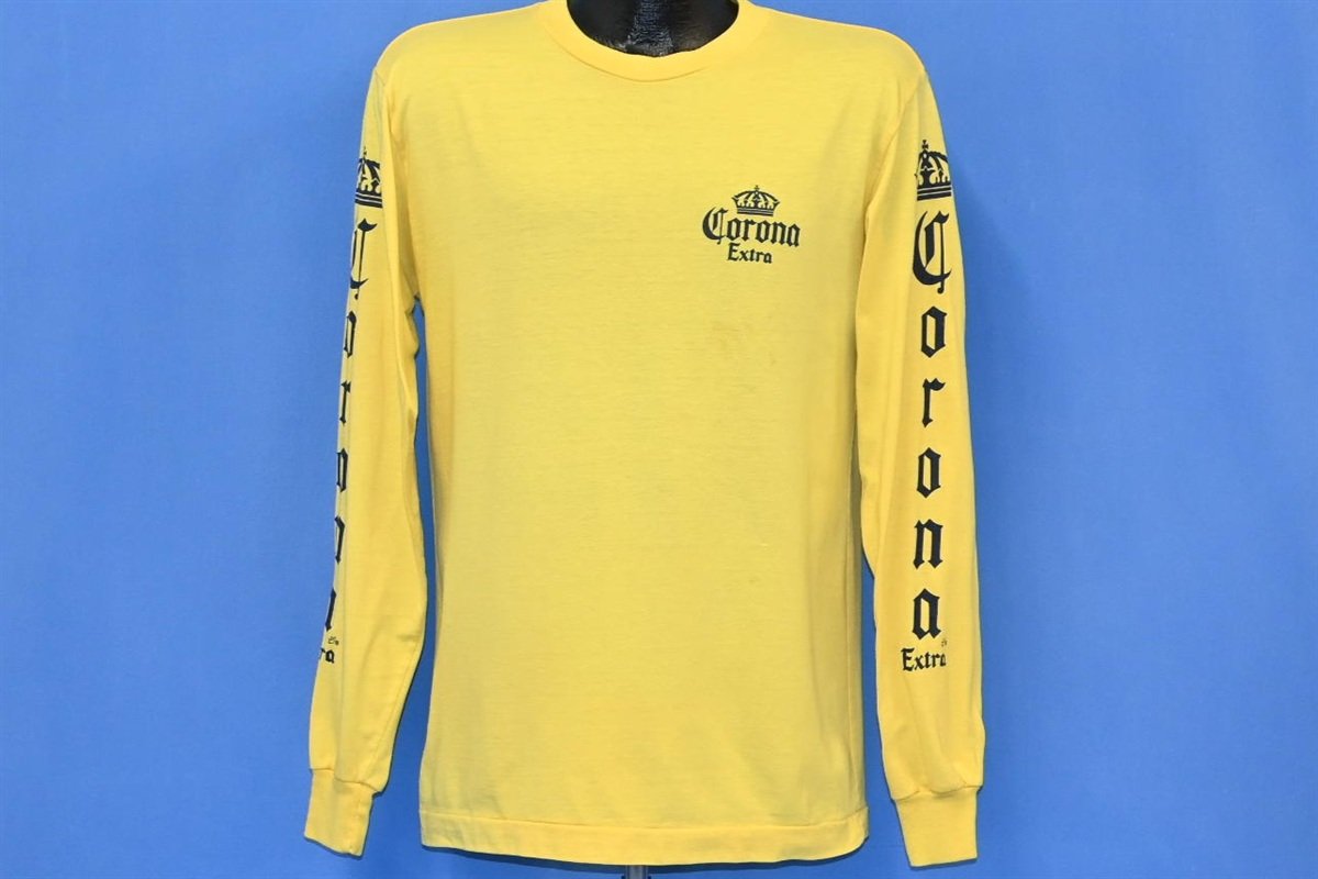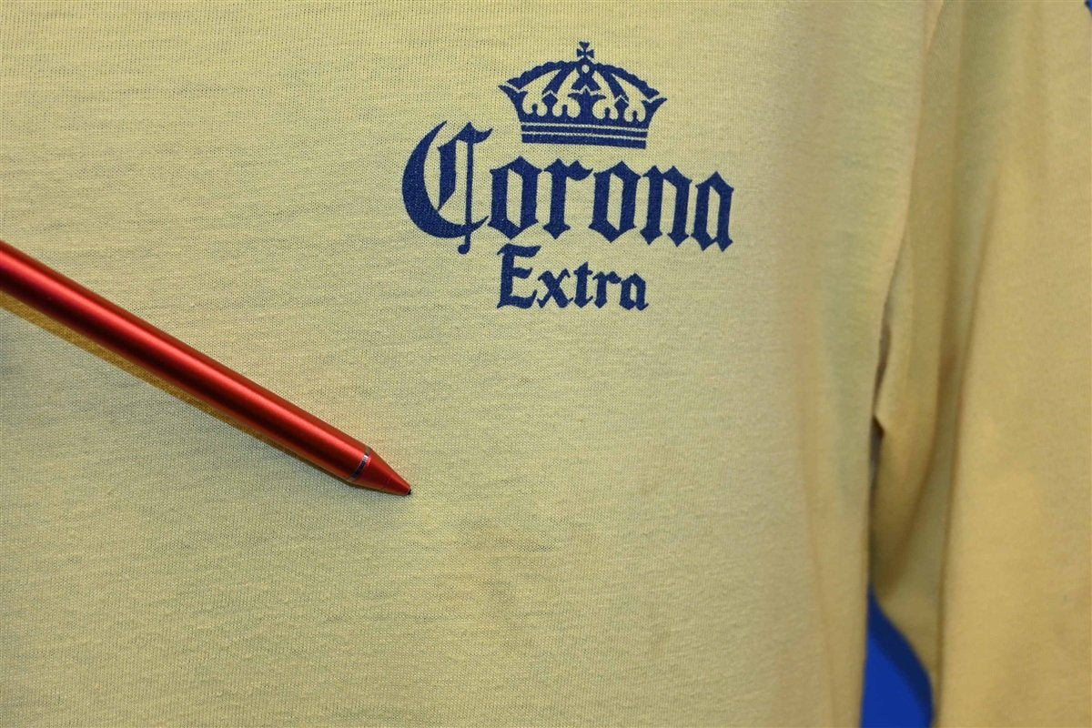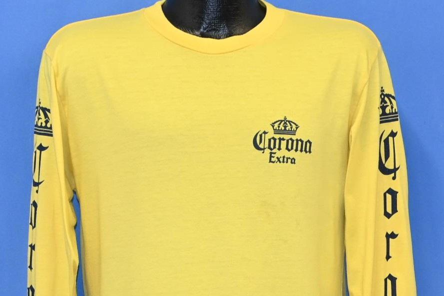 This sweet long sleeved shirt promotes the popular Mexican beer, Corona Extra. The refreshing pale lager was first brewed in 1925, and by the end of the 90s it had become the top-selling imported beer in the United States, and one of the best-selling beers worldwide. Corona's recipe utilizes corn, one of Mexico's most abundant crops, and this is what gives the beer its signature light flavor and appearance. The brand is also known for its clear bottles. While most brands use colored glass to protect the beer from oxidization, Corona chose to use clear glass to show off the drink's sunny, golden color.