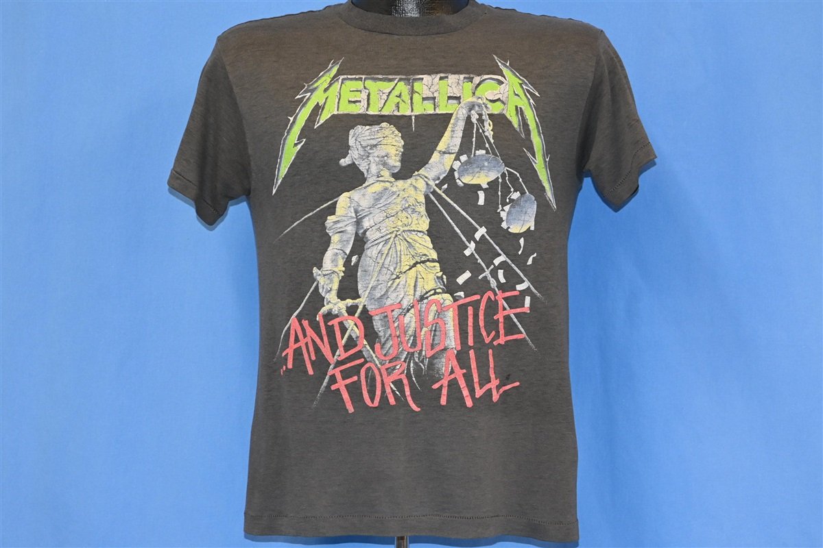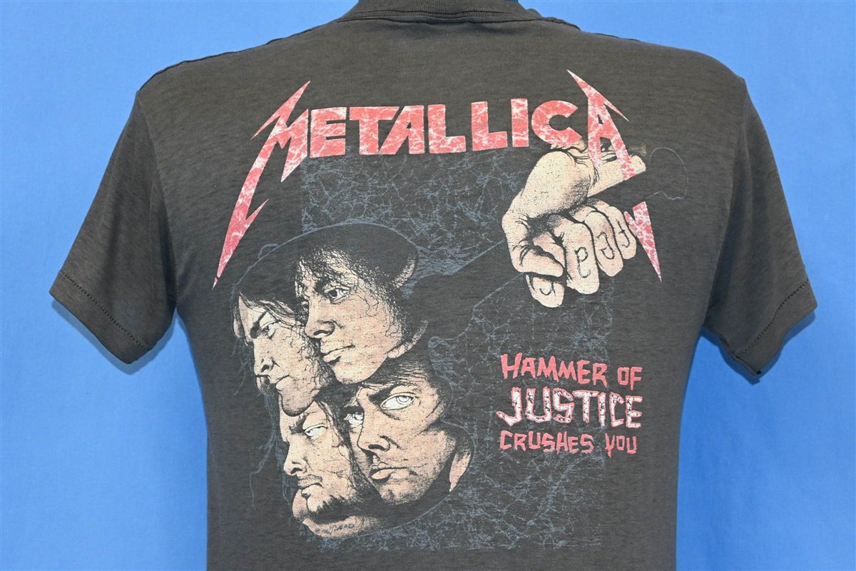 This awesome double sided shirt was made for the beloved heavy metal band Metallica, and it celebrates their 1988 album ...And Justice for All. The front of the tee features the same portrait of Lady Justice that was created by Stephen Gorman for the cover of the album. Meanwhile the back has the band members James Hetfield, Kirk Hammett, Jason Newsted, and Lars Ulrich, beside the words "hammer of justice crushes you".