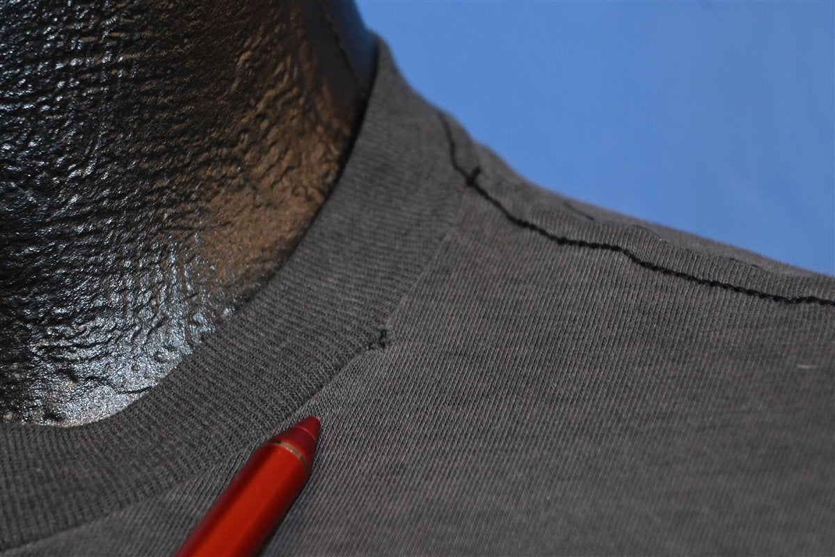 Fits like a modern unisex adult medium. This shirt is faded, and there's some wear along the collar and a thin spot on the front, see pics.