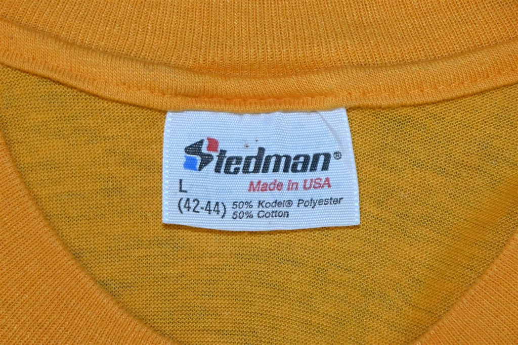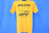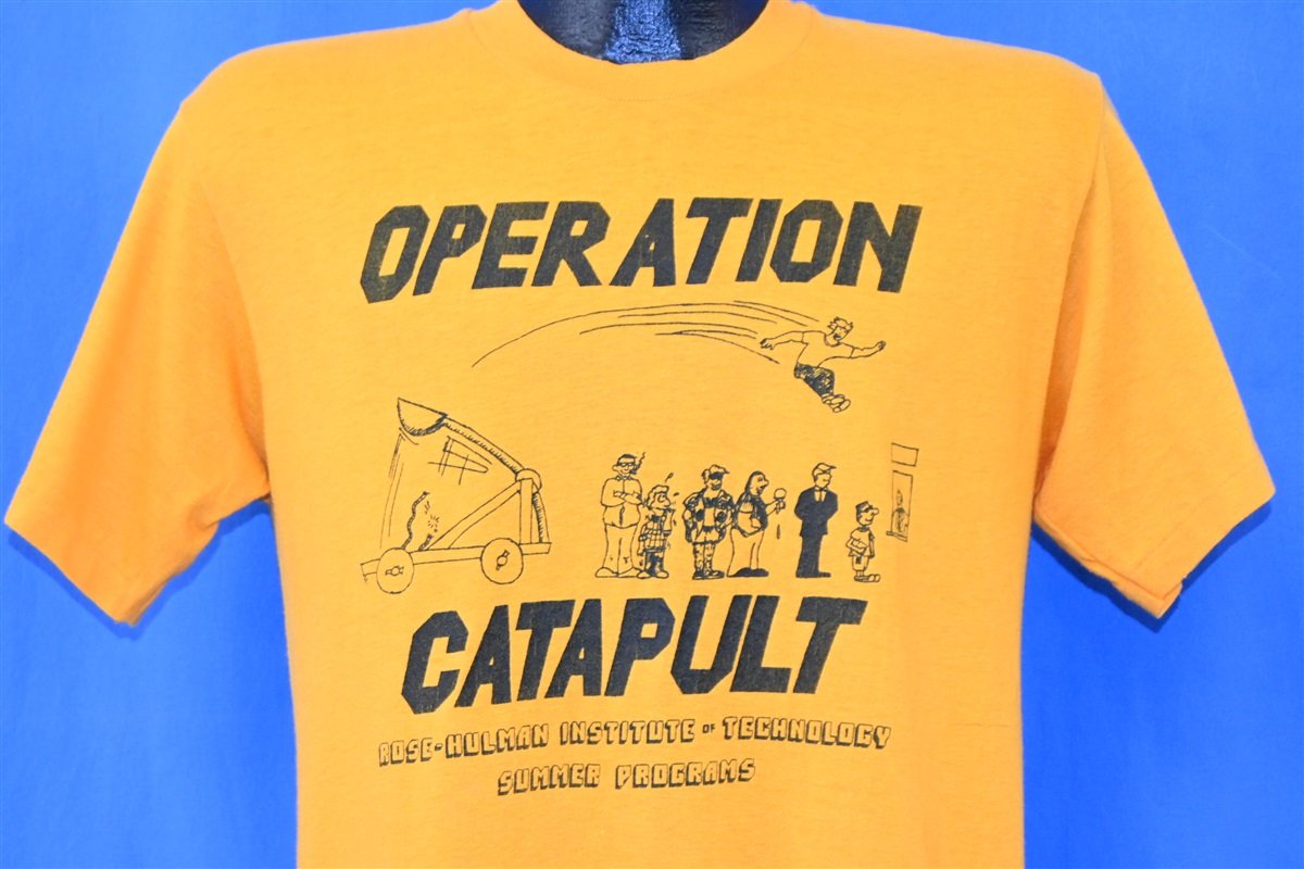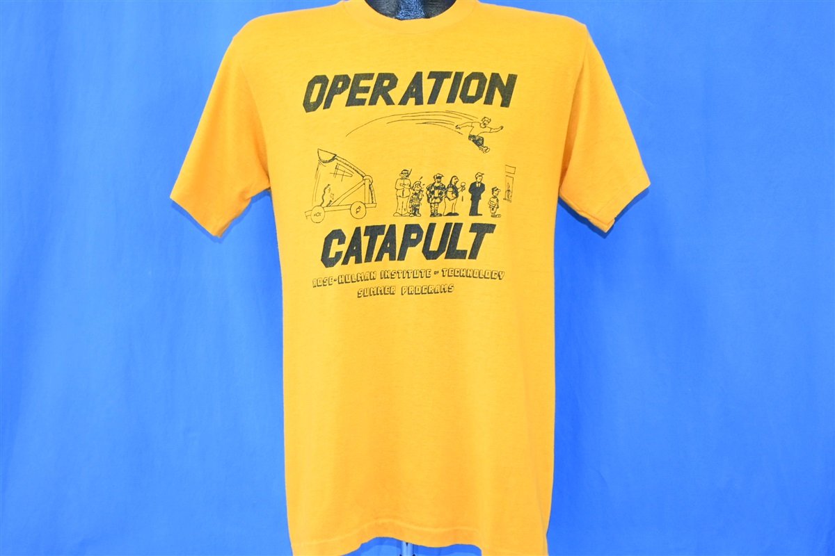 This bright yellow tee commemorates something called Operation Catapult, which was a part of the summer programs at the Rose-Hulman Institute of Technology. Rose-Hulman is the home of the Fightin' Engineers, and the school can be found in Terre Haute, Indiana. Operation Catapult is a summer camp experience offered to high school students. The camp program allows the students to explore science and engineering, and anyone who completes the program earns two hours of free elective credits should they later choose to attend the college.