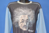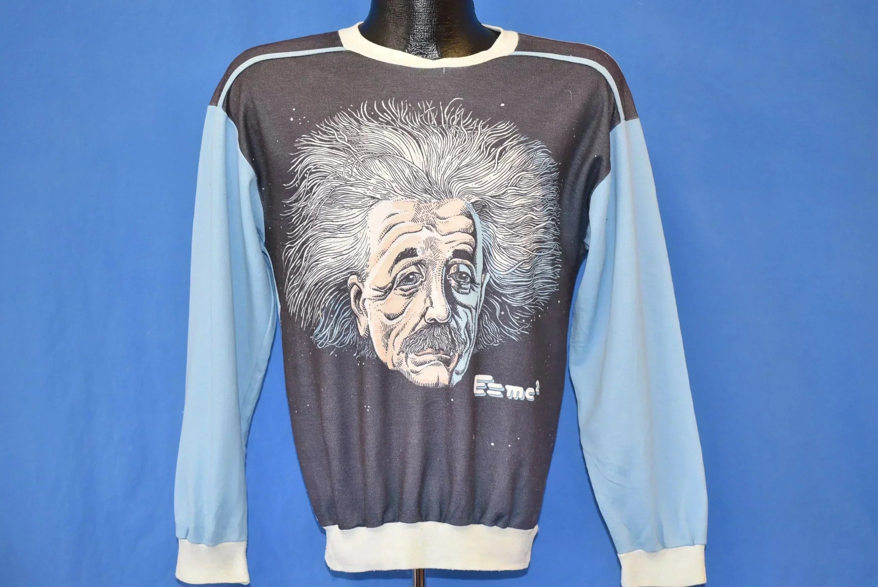 This unique long sleeve shirt features the portrait of famed German born theoretical physicist, Albert Einstein. Known most widely for his theory of relativity, which encompasses theories of both special relativity and general relativity, Einstein is depicted here next to his famous equation E=mc2. This shirt is unbranded with a foreign tag. The image of Einstein shown here makes a bold statement, as his eccentric hair and expressive face have become a symbol of mad science.