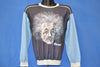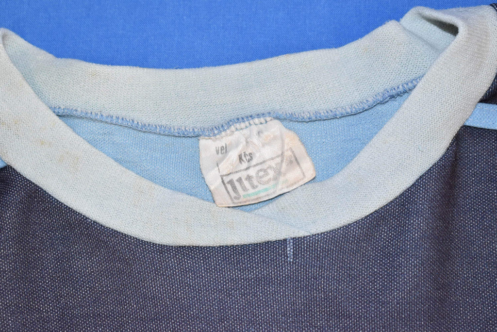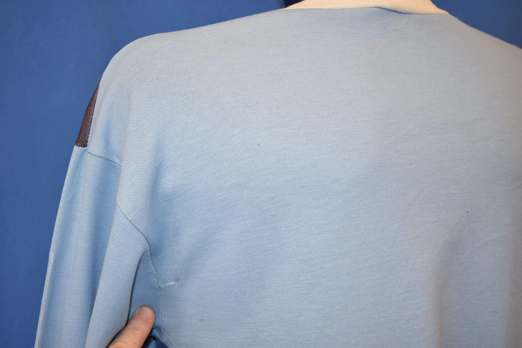 This shirt fits a modern unisex adult Medium and has sweatshirt-style bands around the waist and cuffs. There is a small repair on the back and light discoloration around the neck, see pics.
