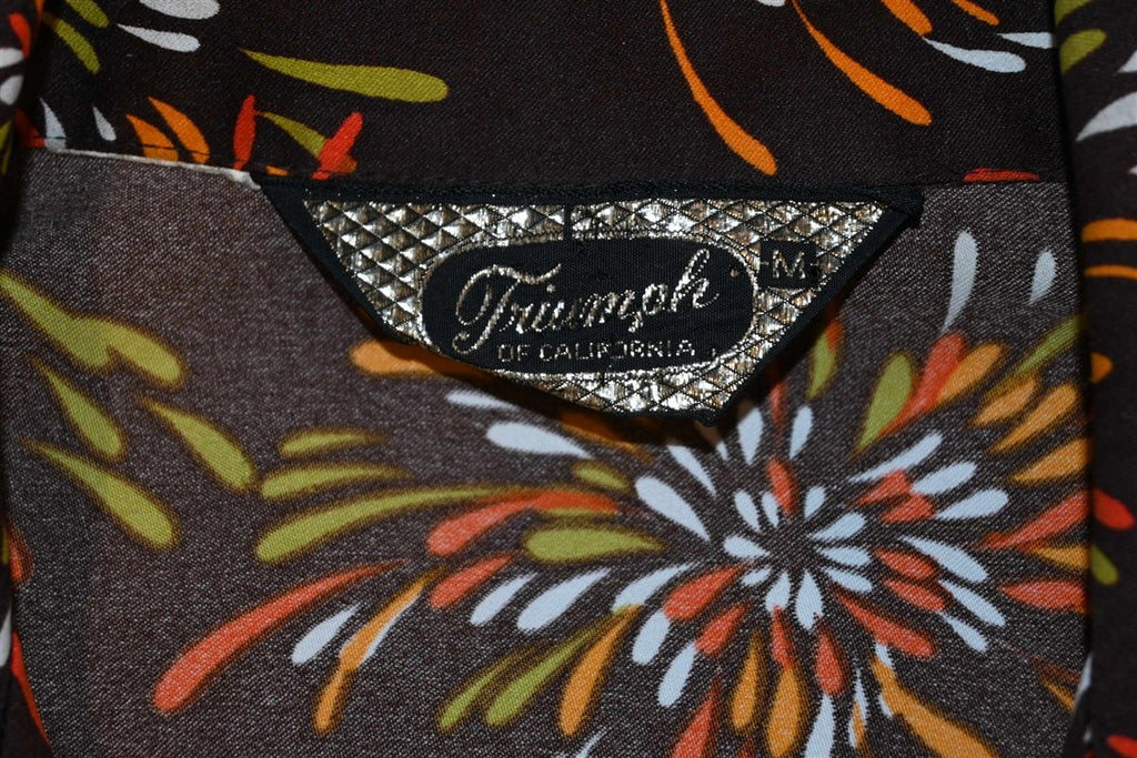 This awesome men's disco shirt was made in the 70s by Triumph and it sports the classic 70s style big collar. The shirt is made from a silky nylon material and comes in a rich deep brown color with a sweet pattern of exploding fireworks. The shirt has long sleeves and button front closures.