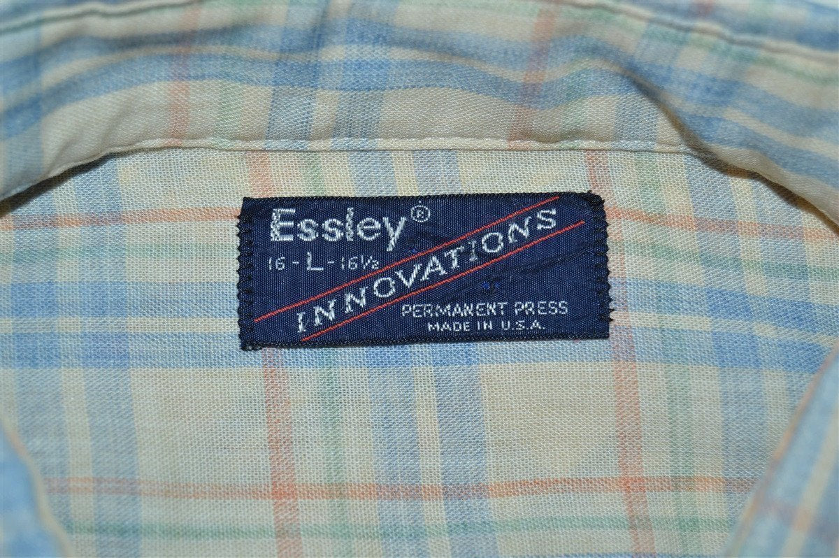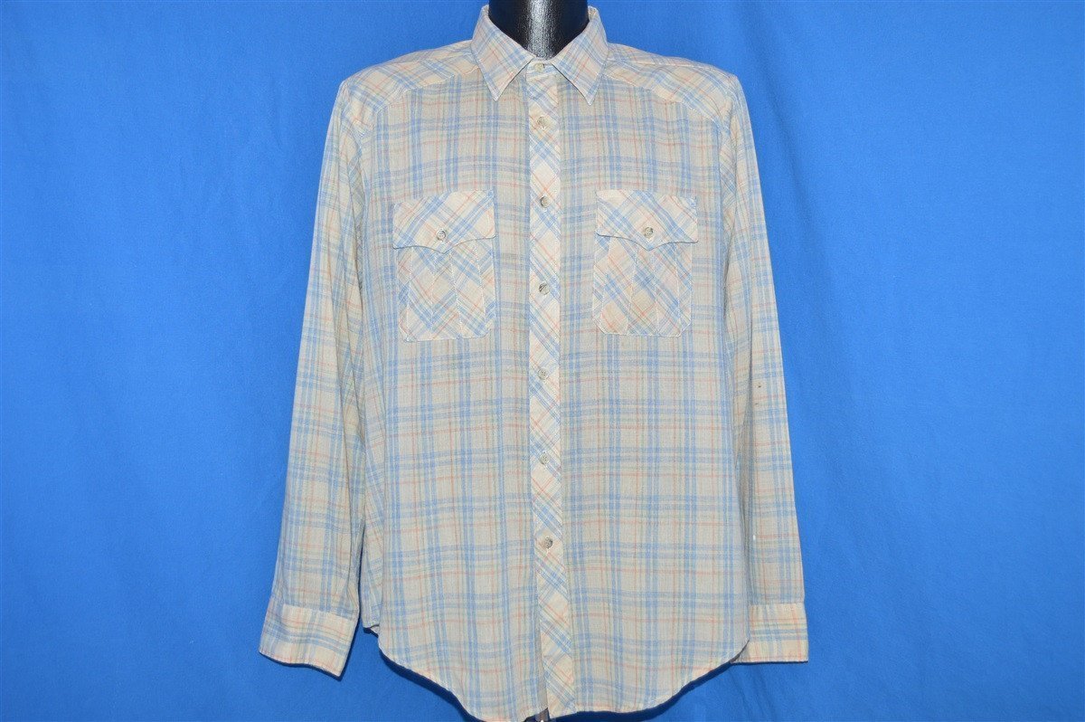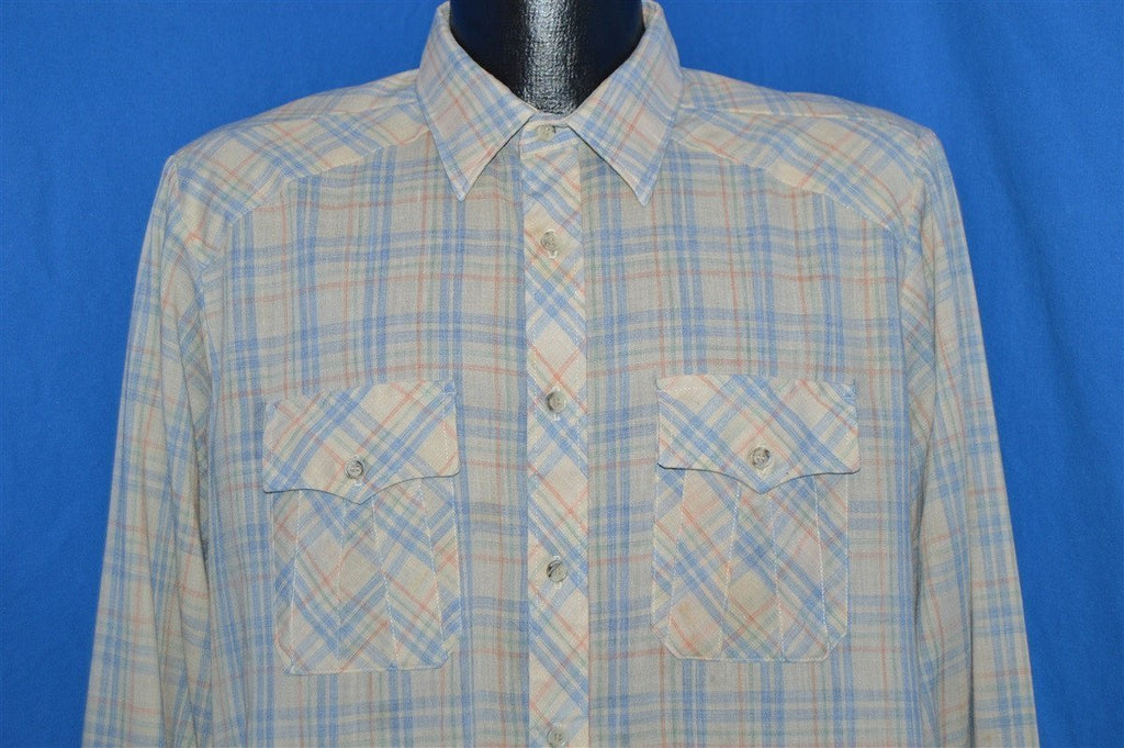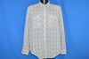 This vintage button down shirt is made from a blue, off-white and green plaid material. The chest pockets have diagonal stitching on the front and scalloped pocket flaps.