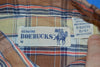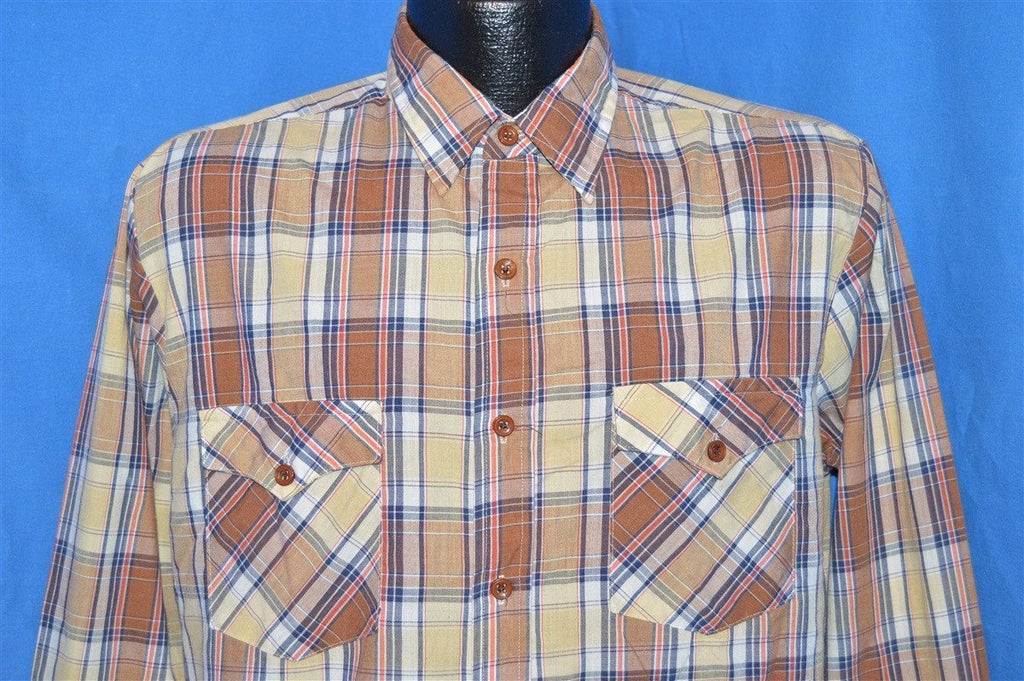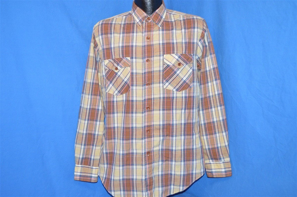 This brown, blue and beige vintage shirt is a plaid button down. The shirt has long sleeves and is tapered at the bottom.