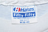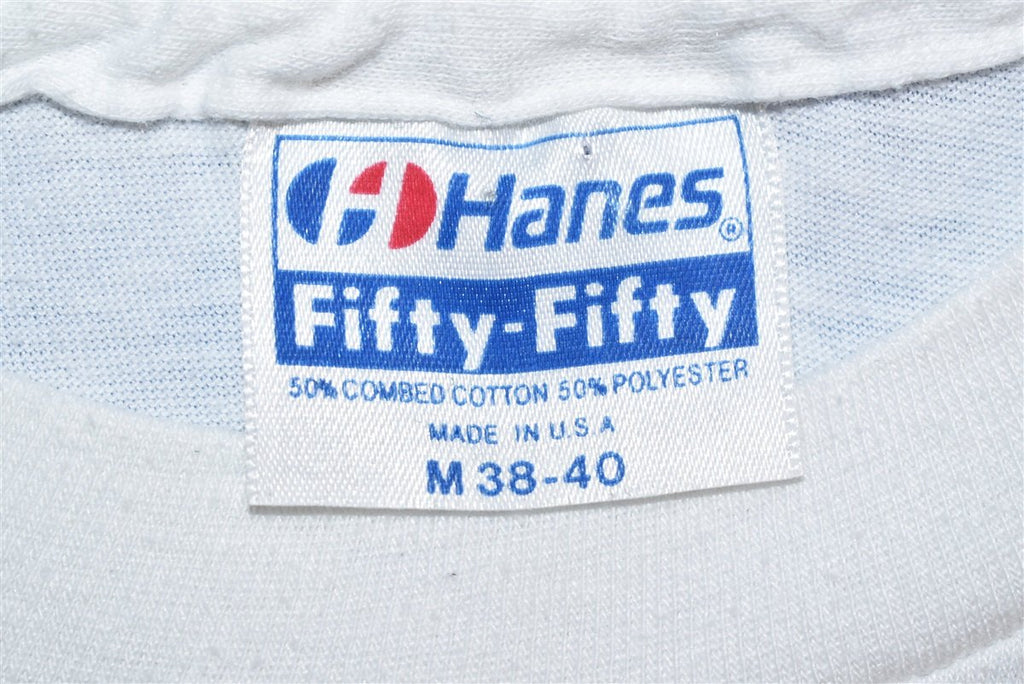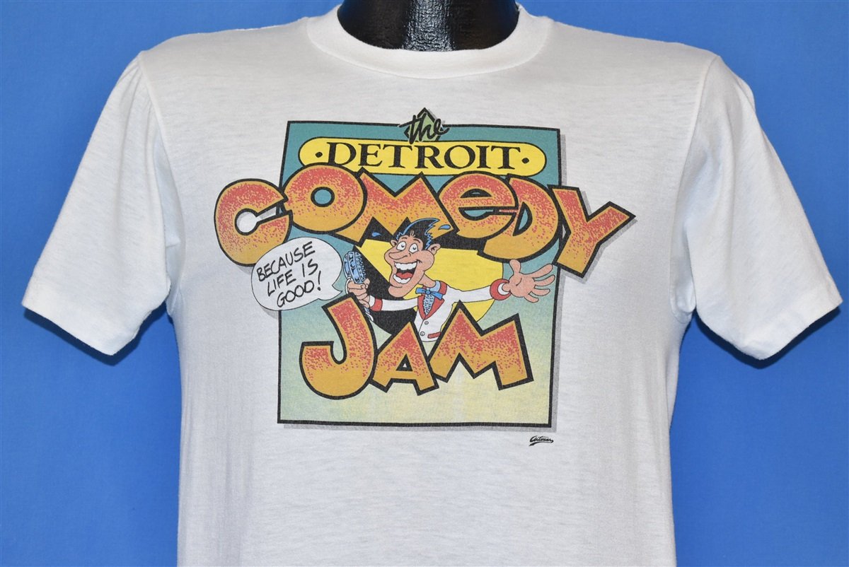 This white vintage t-shirt is from the Detroit Comedy Jam, a comedy special which took place around the mid 80s. The performance included several stand up comedians and it was filmed live for HBO and distributed by George Carlin's company Carlin Productions. The show included four comedians: Mike Binder, who is also known for his directing and screen writing, Dave Coulier, who is arguably best known for his role as Uncle Joey on Full House, Howie Mandel, who later went on to become the host of the popular game show Deal or No Deal, and Paul Rodriguez, a Mexican-American comedian who has also appeared in several films. The shirt features a cartoon graphic of a man saying, "Because Life is good".