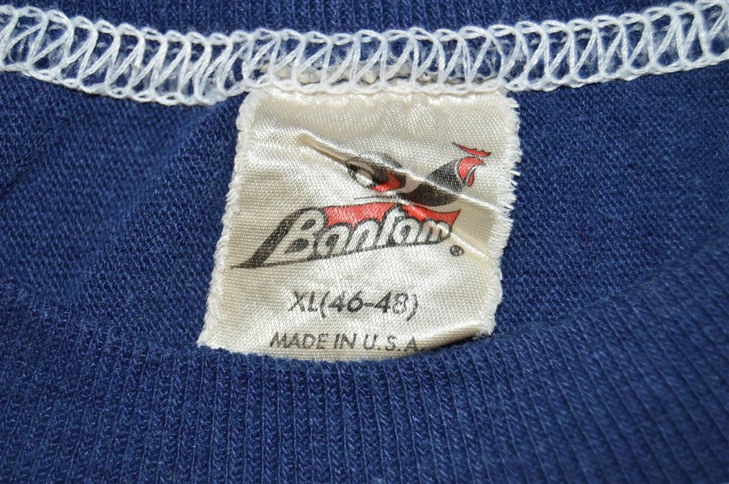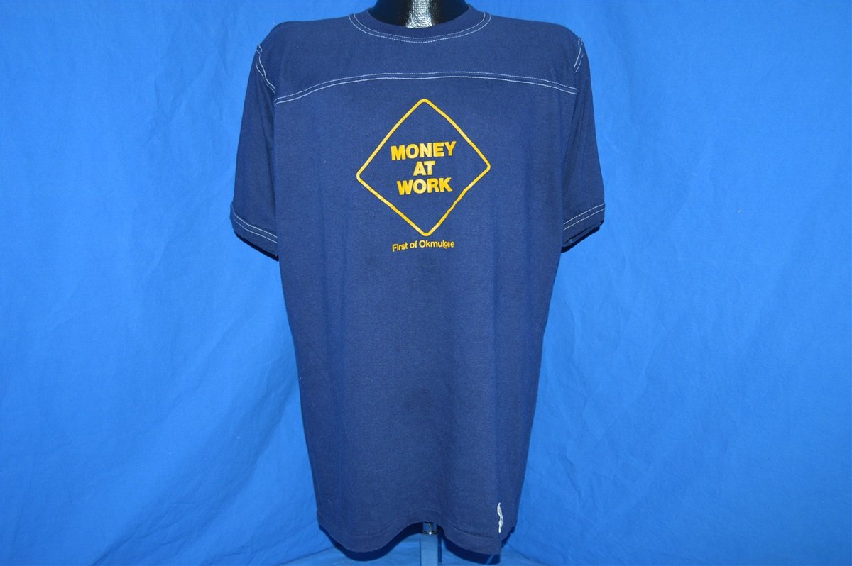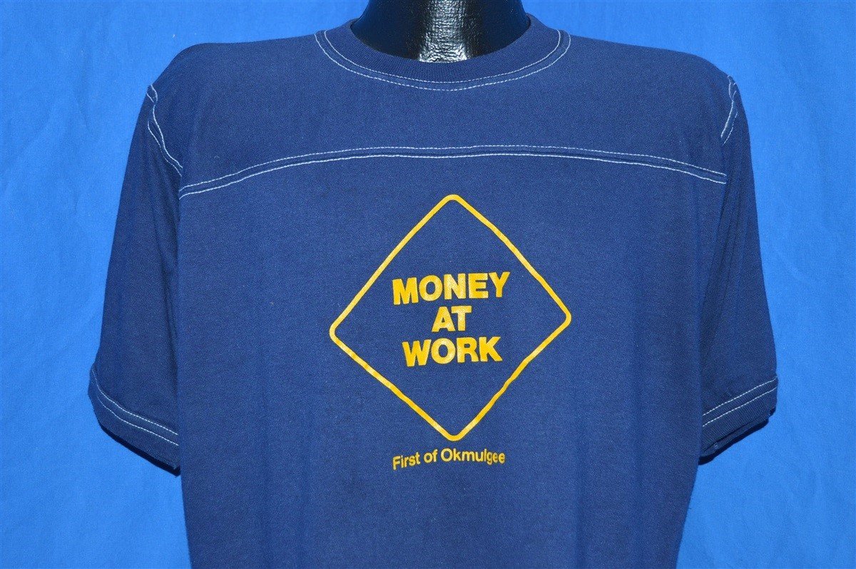 This super soft and comfy vintage shirt comes in a rich dark blue with white stitching. It was made in the 80s for the First National Bank of Okmulgee in Oklahoma. The shirt includes a graphic that says Money at Work. The band was established in 1917 and has since grown to four locations. It is the 70th largest bank in the state of Oklahoma.