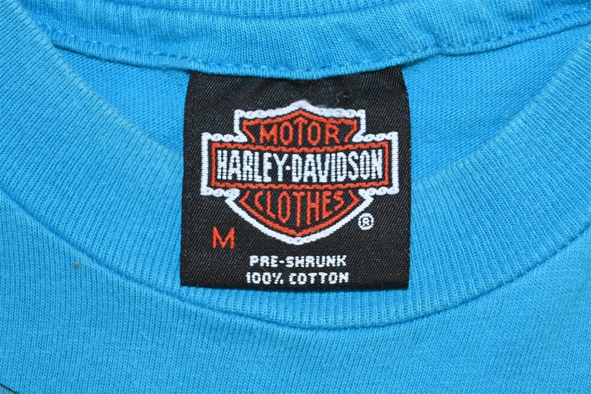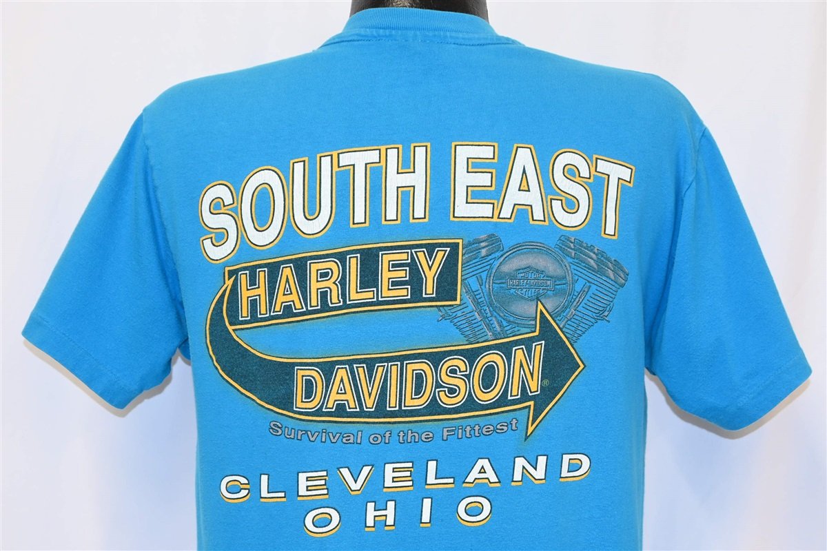 This awesome tee features a graphic for a Harley-Davidson retailer in Cleveland. Ohio. The retailer on this shirt, Southeast Harley most likely sponsored a HOG, or Harley Owners Group, chapter. HOG is the official Harley-Davidson community marketing club that boasts over 1 million members worldwide. The only stipulation for joining is that you own a Harley bike. Local chapters are hosted by Harley retailers and the clubs are known to host rallies and charity benefits. The official charity of HOG is the Muscular Dystrophy Association although many local chapters will fundraise for a variety of causes.
