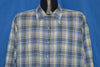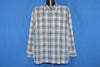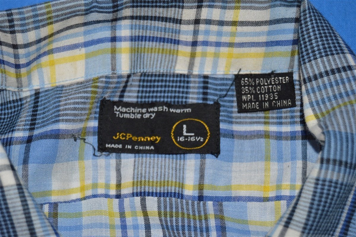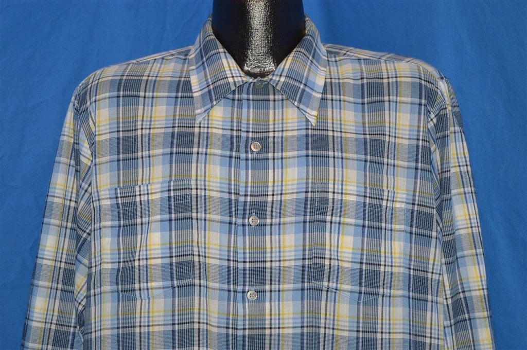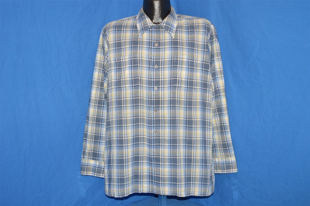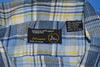This plaid vintage shirt has blue, white and yellow stripes. The shirt is a button down with long sleeves.