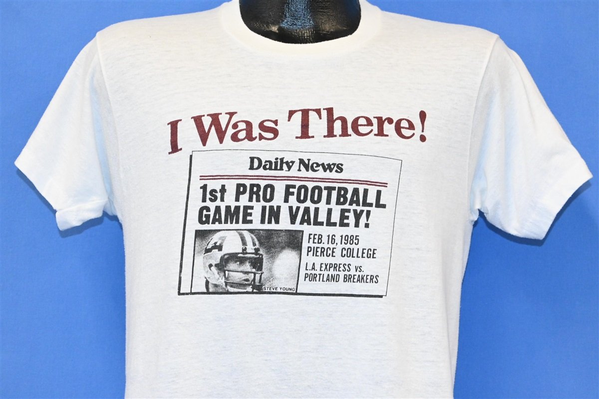 This sweet shirt commemorates a USFL game between the Los Angeles Express and the Portland Breakers. Celebrated as the first pro football game to take place in the San Fernando Valley, the game took place at Pierce College's John Shepard Stadium. This shirt also features a graphic of LA Express quarterback Steve Young, who later went on to play for the Tampa Bay Buccaneers, after the United States Football League was dissolved.