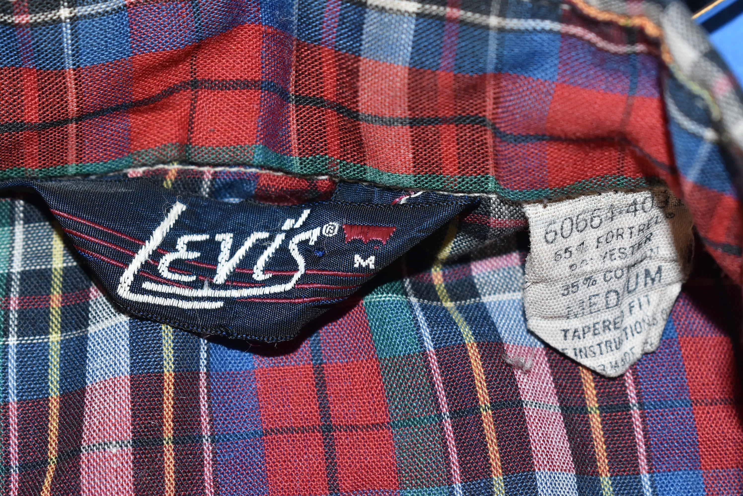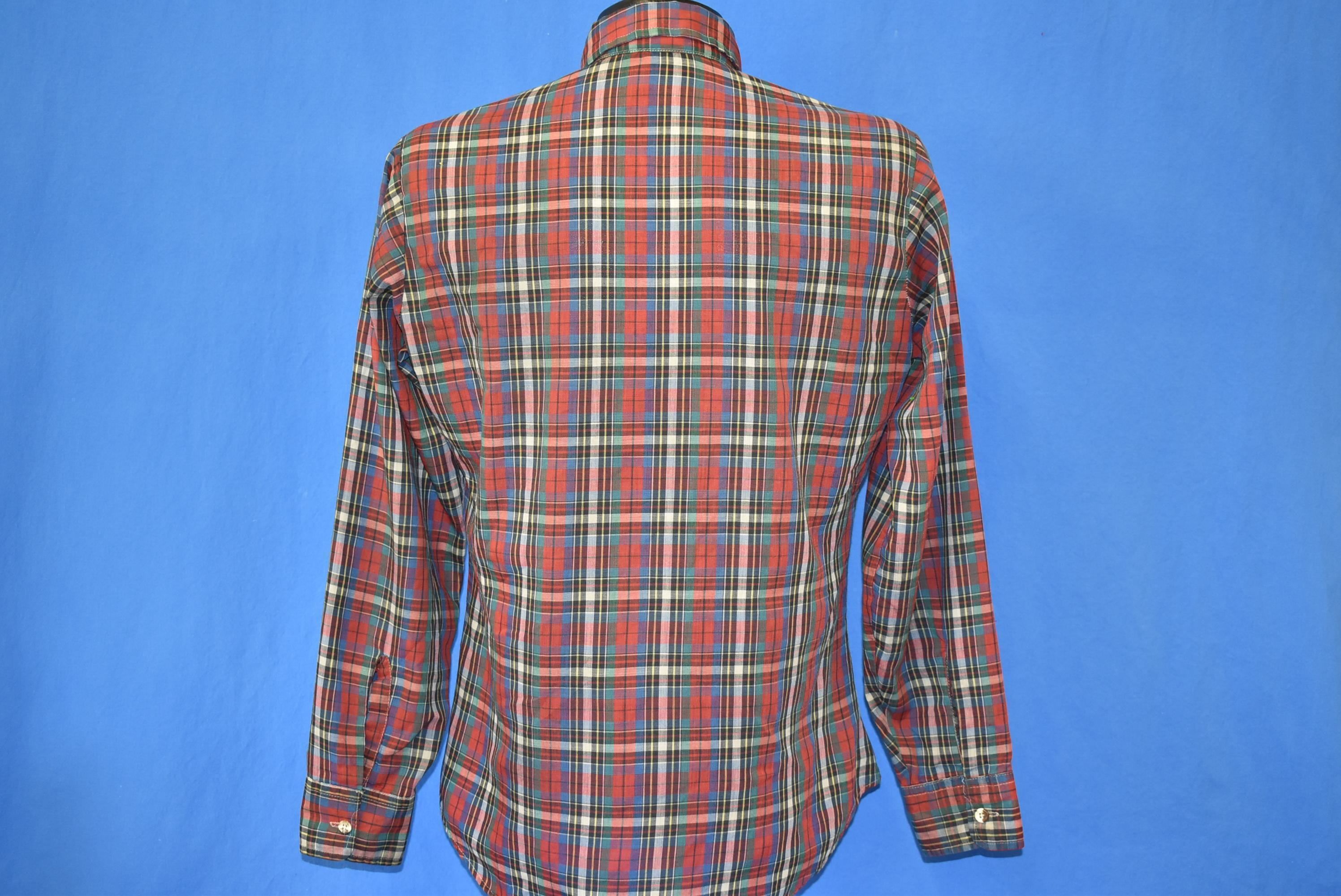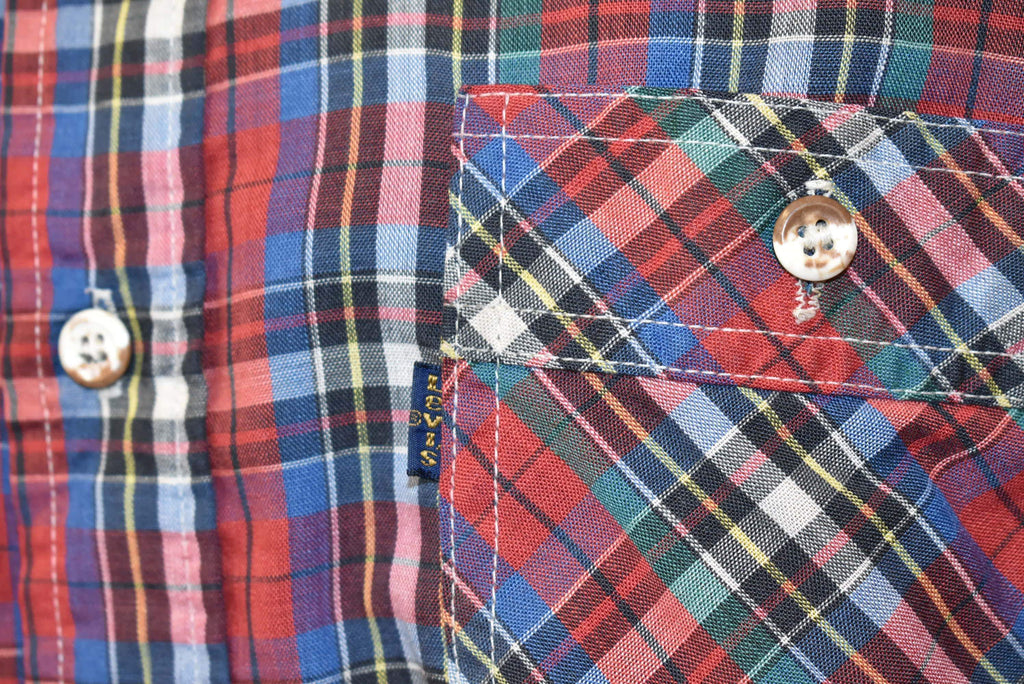 This vintage shirt is from Levi's in the 80s. The shirt has two button flapped chest pockets and a rounded hem. It's covered in a multi-color all over plaid print and the shirt has a tapered fit to it.