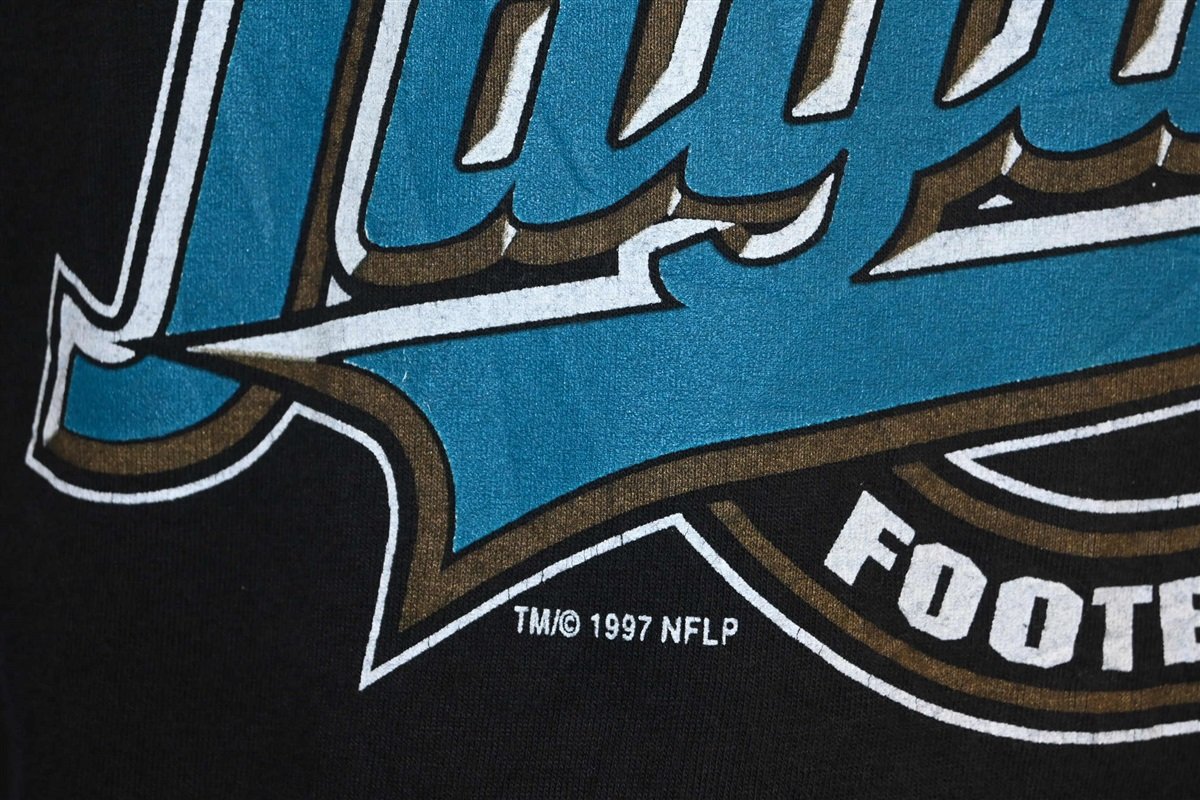 This sweet football tee reps the Florida team, the Jacksonville Jaguars. The Jags were founded in 1995 alongside the Carolina Panthers. This shirt is copyright 1997, and during that season the team finished second in the AFC Central Division with a record of 11-5. The following season, the Jags went on to earn their first ever divisional title.