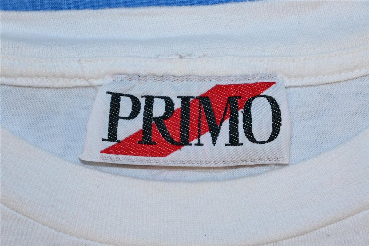 This cool t-shirt is from a brand called Primo, which looks to have been an apparel printing company from the 1990s. The copyright on the shirt is for Primo Designs Inc. which is the name of a custom screen print and embroidery company based out of Springfield, Illinois. The Primo tag has also been found on licensed apparel for properties like the Teenage Mutant Ninja Turtles and Batman.