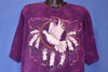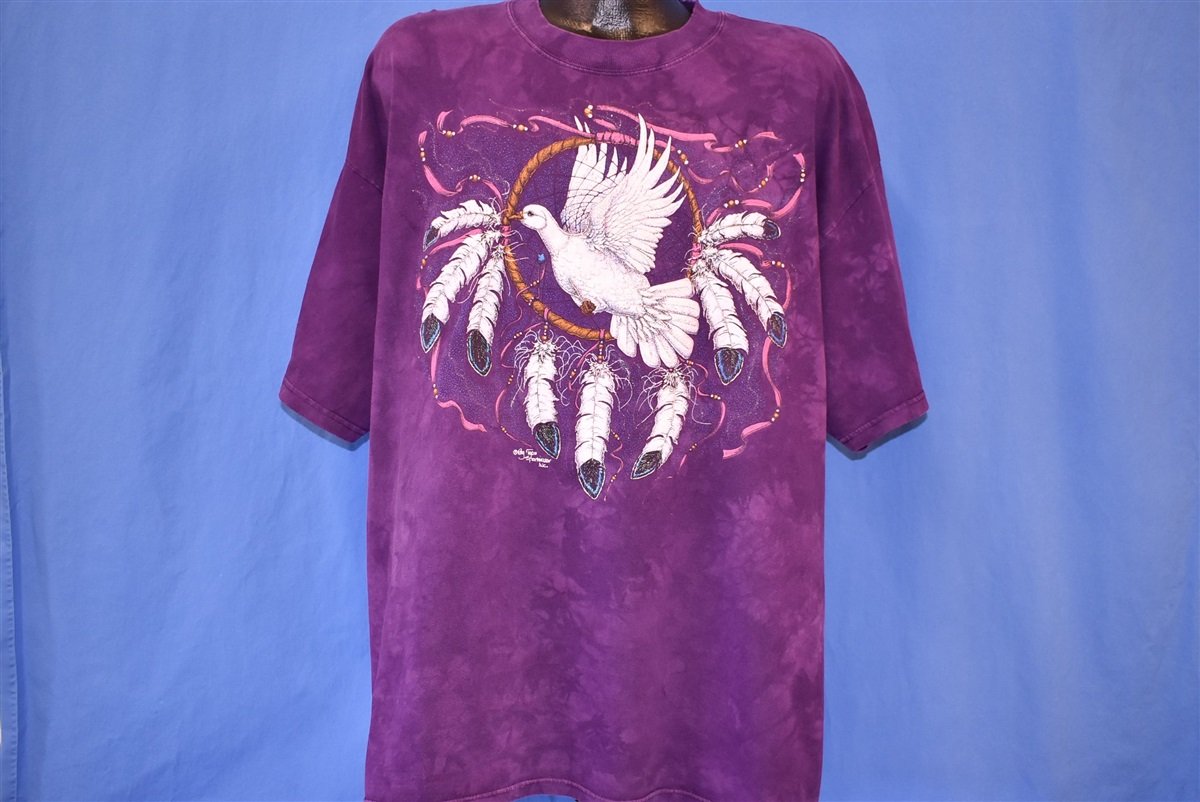 This vintage perfectly captures the Native American spirit with tribal motifs such as the dreamcatcher and white dove. It's a 1990s original featuring an awesome acid wash, cool oversized fit, and a classic Rag Tops tag. In native cultures the dreamcatcher serves as a talisman which protects people from nightmares. The dove is a symbol of enduring and everlasting love.